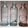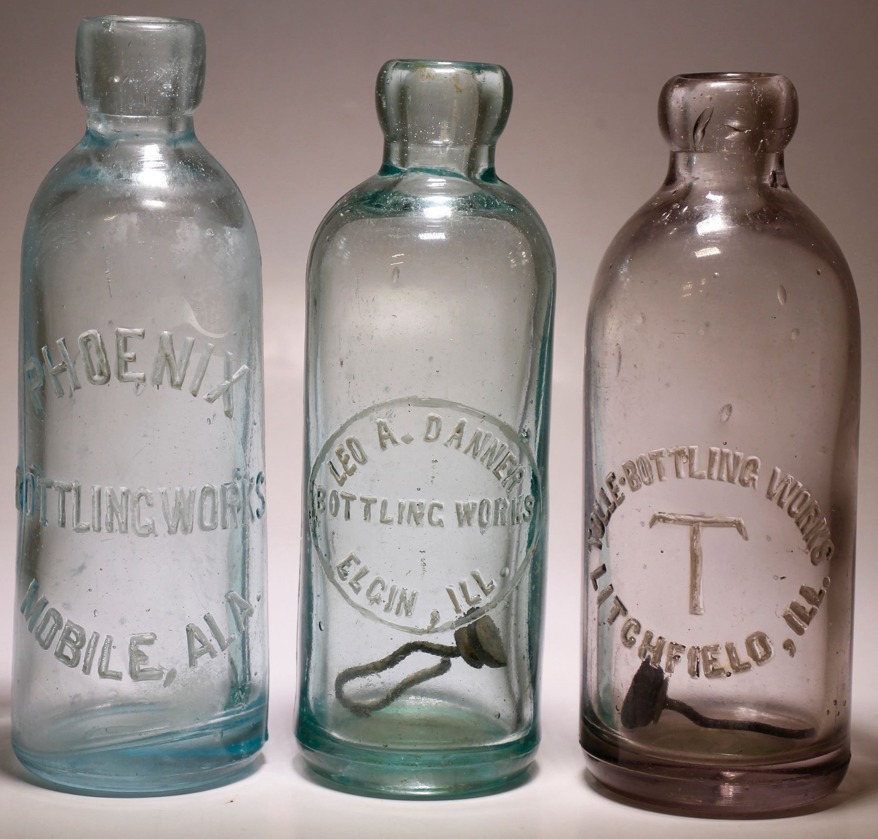 Item # 1 of 3 : Phoenix ( au ) / Bottling Works / Mobile , Ala. ( ad). // Base embossed " B ", laying on the right side. Reverse at the base says: I . G. Co. // Aqua, hutchinson type soda. 7 1/8" tall , tooled top, with an odd...higer shoulder. Fairly clean, but has a inside water stain, in the front shoulder. Light scratching in the body area . Also, 2 ...1 / 16" lip flakes, very minor though. No other damage. Item # 2 of 3 : Embossed on the front of the bottle, in an oval slug plate is : Leo a. Danner ( au) / Bottling Works / Elgin , Ill ( ad ) // Base : Upside down # 16 // Aqua, hutchinson style soda. 6 7/8" tall, tooled top, clean and shiny. Really nice , n there are only a few nminute wear maks , in the body. Item # 3 of 3 : Tolle Bottling Works. / large " T' / Lichtfield, Ill // Base: Embossed large : " T " // Clear, turning...sun colored AMETHYST, 6 5/8" tall, tooled top. , and clean Ultra minute body wear , and a 1/4" base flake. ALSO, PART OF THE TOP, UNFINISHED , BUT NOT DAMAGED. Otherwise really nice. Nice trio of specimens, with different embossing patterns. ( RH)