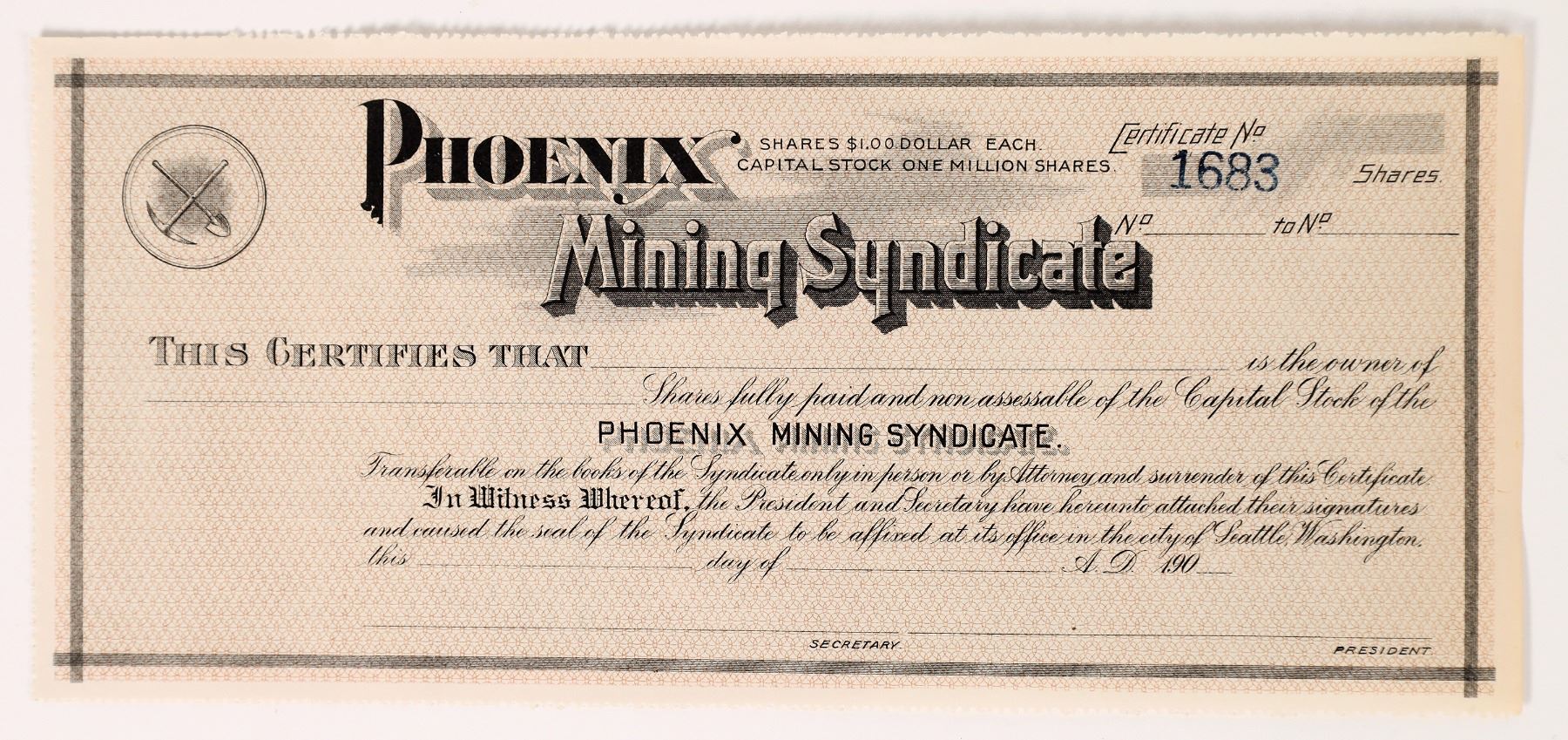 Phoenix Mining Syndicate blank stock certificate #1693. It is offering stock in the company for $1 per share. Please see photos for more details. Arizona 1900s Arizona