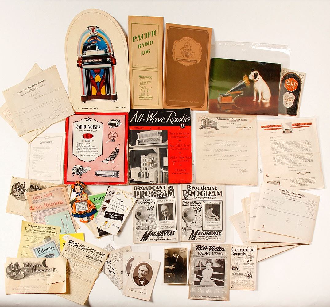 Large group of 75. Includes: 40 invoices/billheads for Buehn Phonograph Co., Edison Distributors, c.1920s; group of booklets/pamphlets for radio tubes, phonographs, radios from Westinghouse, Zenith, Philco, California Coil Co., Gilfillan, Sonatron, and others; 1932 booklet on Radio Noises and Their Cure, 75 pages with illustrations; Feb. 1938 issue of Air Wave Radio; two 1924 Broadcast Programs for Pacific Coast; letterheads for the Midwest Radio Corp.; Pacific Radio Log; colorful jukebox advertising brochure; Atwater Kent Radio booklet c.1920s; and more! Please inspect. (Prag Collection) Date: Location: HWAC# 55409