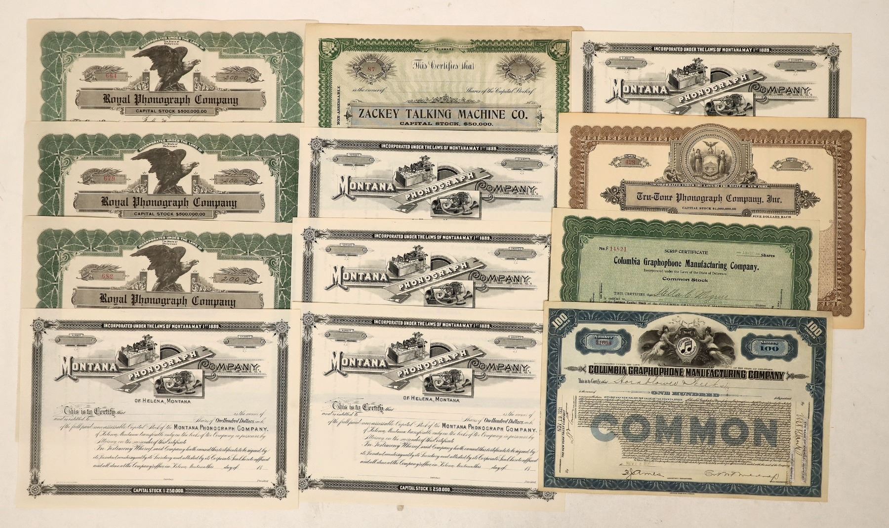1x 1921 Columbia Graphophone Manufacturing, 1x 1920 Columbia Graphophone, 1x unissued Tru Tone Phonograph, 3x 1917-18 Royal Phonograph, 5x unissued Montana Phonograph with great vignette, unissued Zackey Talking Machine.