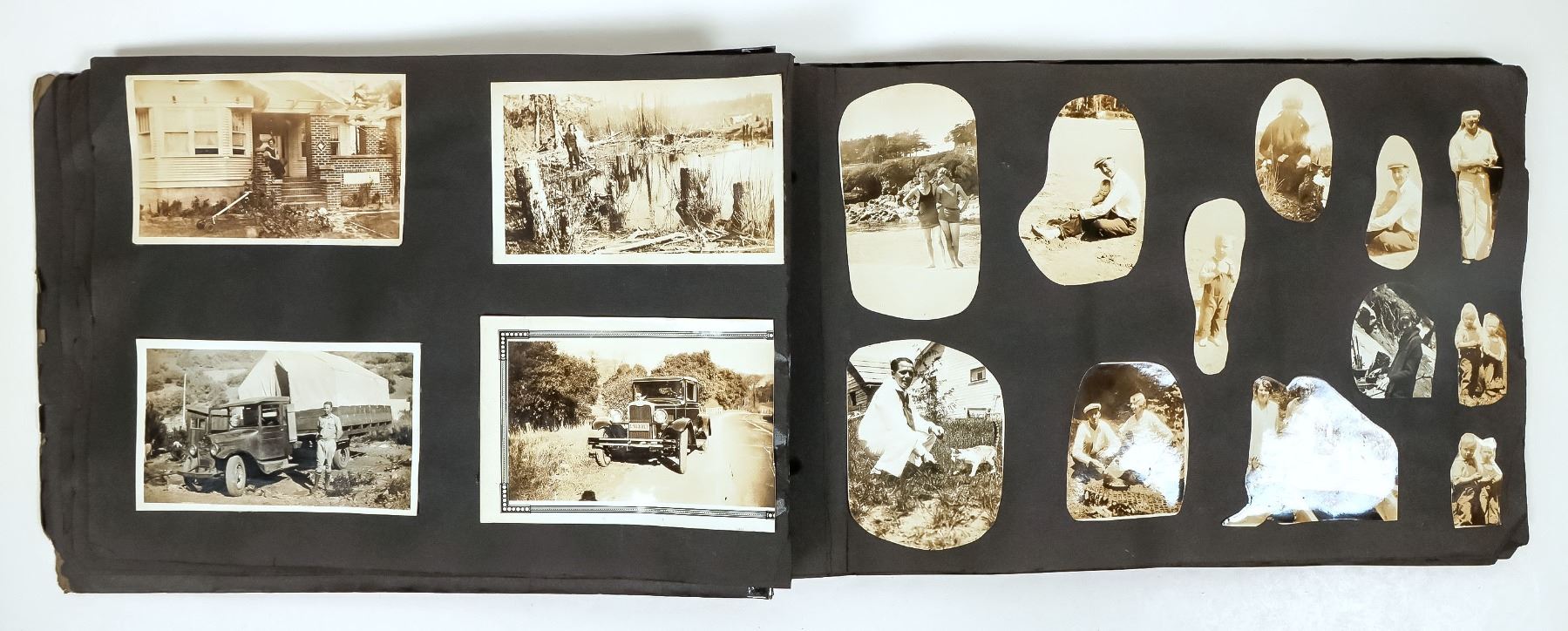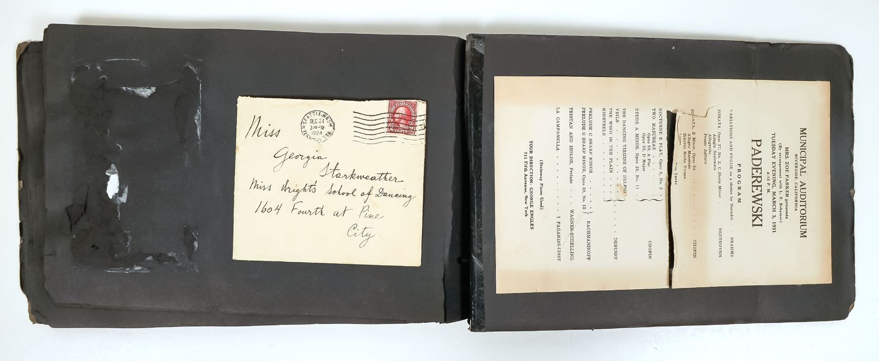 A 14-page photo album containing 79 photos and a program for a piano recital at the Municipal Auditorium in Riverside, Calif., dated March 3, 1931. Also includes a cover postmarked Seattle, Wash., 1924. Photos are mostly of family/people in various locations in California, Hawaii and China.