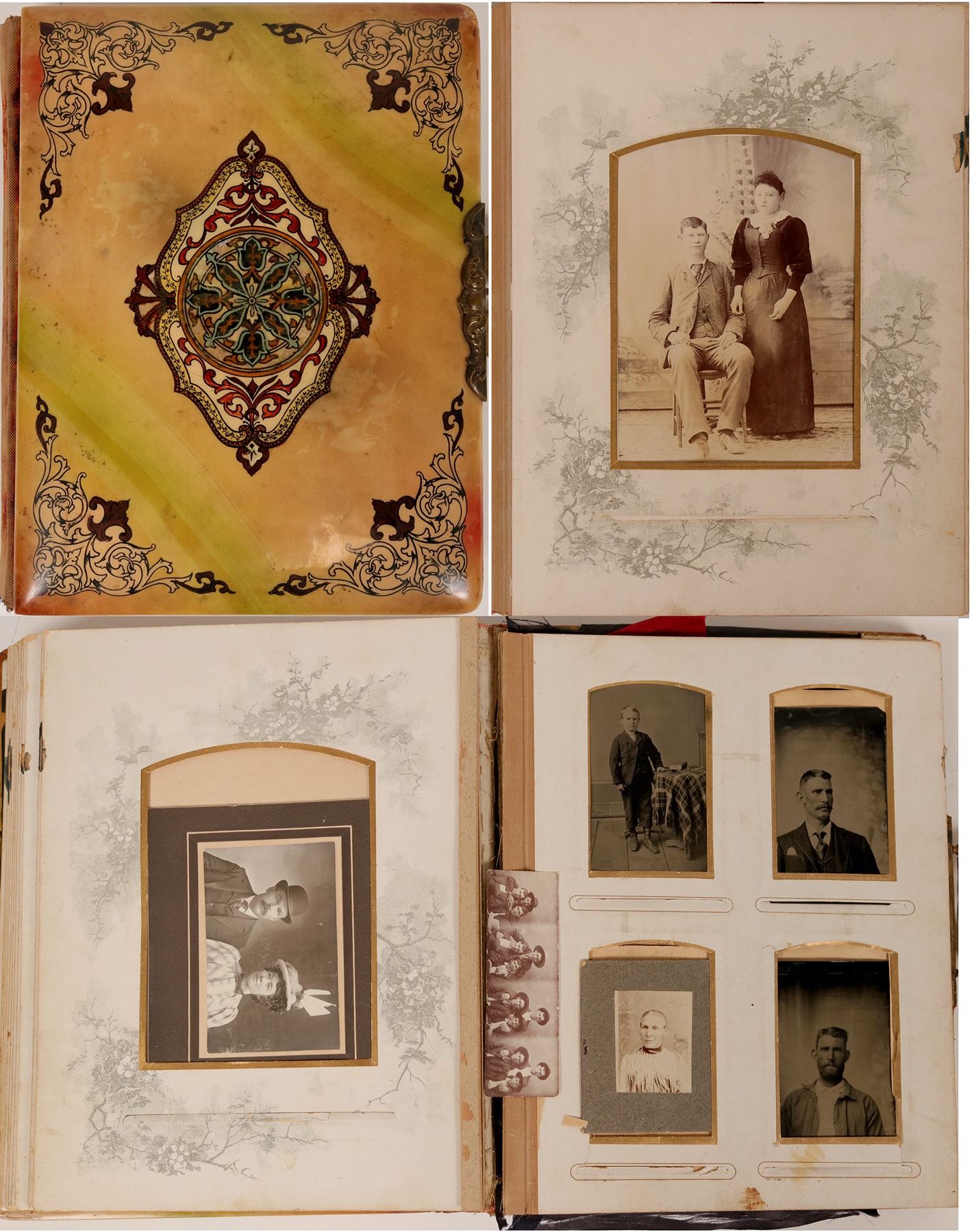 This is a photo album from California and Arizona .c 1890's. There are several older tin type photos along with cabinet card photos from San Bernadine, Los Angeles, Safford, Arizona . A total of 17 cabinet cards, 5 tin types, all in a faux tortoise shell album cover. Condition is very good.