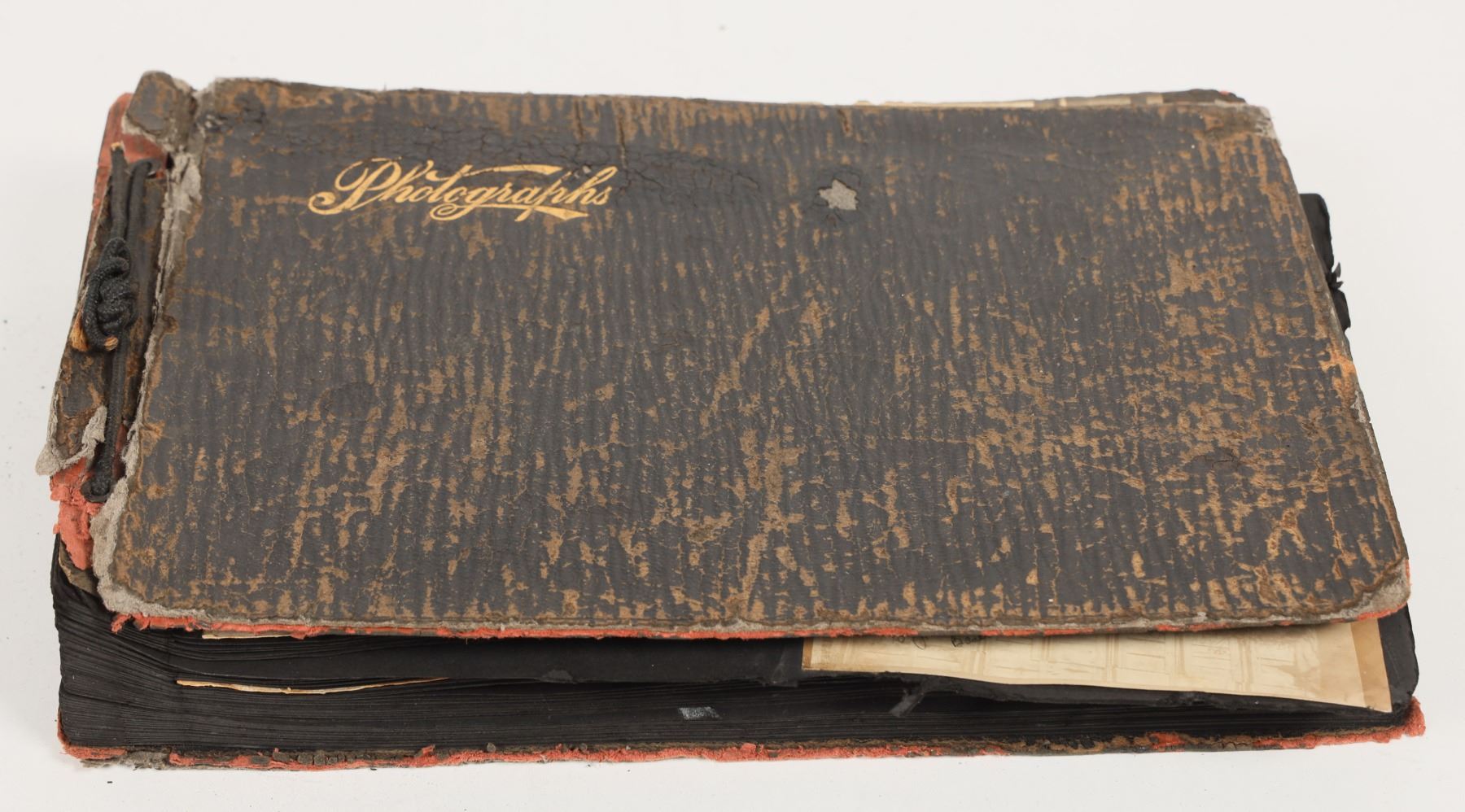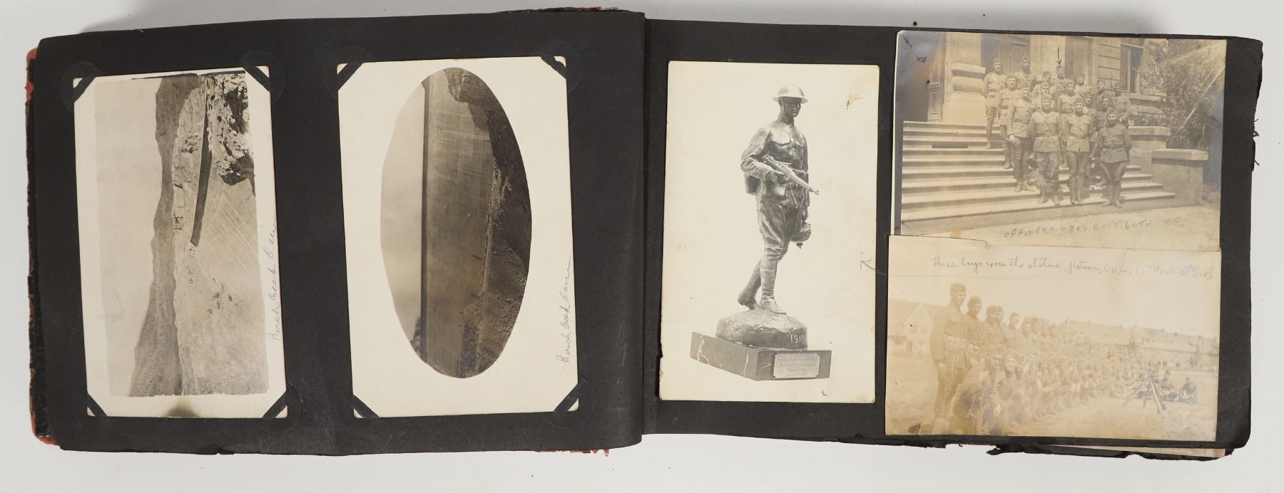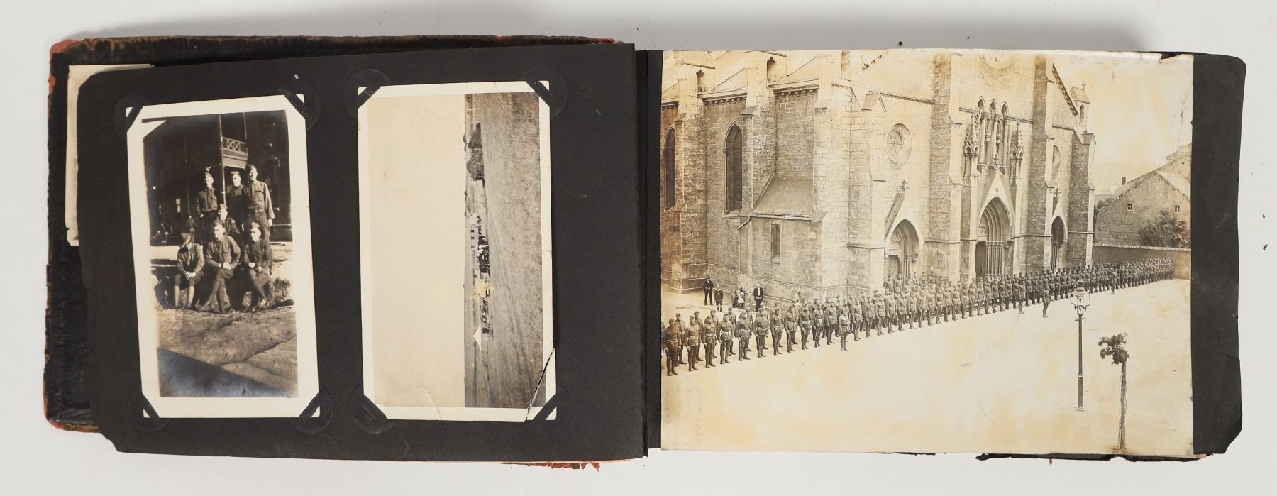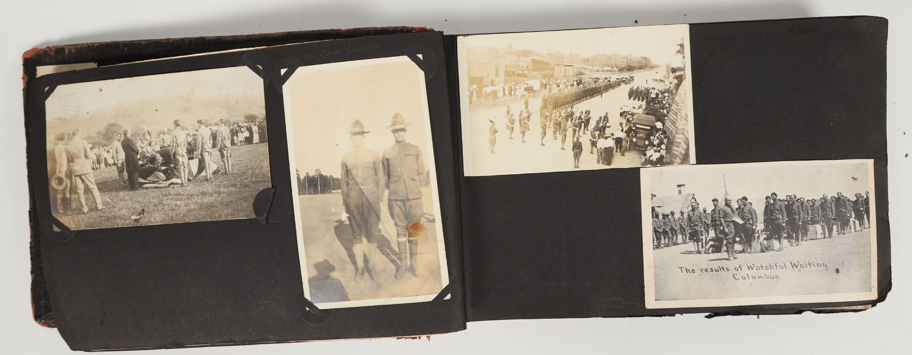 Vintage photo album 44 pages, 13 are not used. Dates from 1915-17. Lot of history. 60th infantry Montana group photo and one fantastic photo outside a cathedral. Lots of WW 1 infantry photos. Some over in France, troops crossing bridge for German Occupation 1st time , Poncho Villa, Mexican War 1915. History buffs will like this. _x000D_