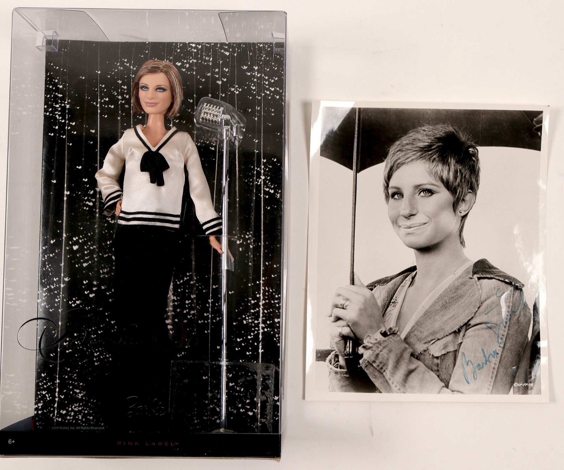 Here are a couple of nice things. Item # 1 of 2 : It is a picture , black n white, 10" high x 8" wide, of Barbara Streisand, with that warm mysterious smile of hers. It certainly was not taken, on a Clear Day, cause she is holding and umbrella. It is also signed, as well. Item # 2 of 2: I saved the best for last, n it's a blast. Its a Barbara Streisand " Barbie Doll" in the box brand new( 1963). Remember, Its a Barbie World, We Just Play In It !! Complete with microphone and plastic cover (RH).