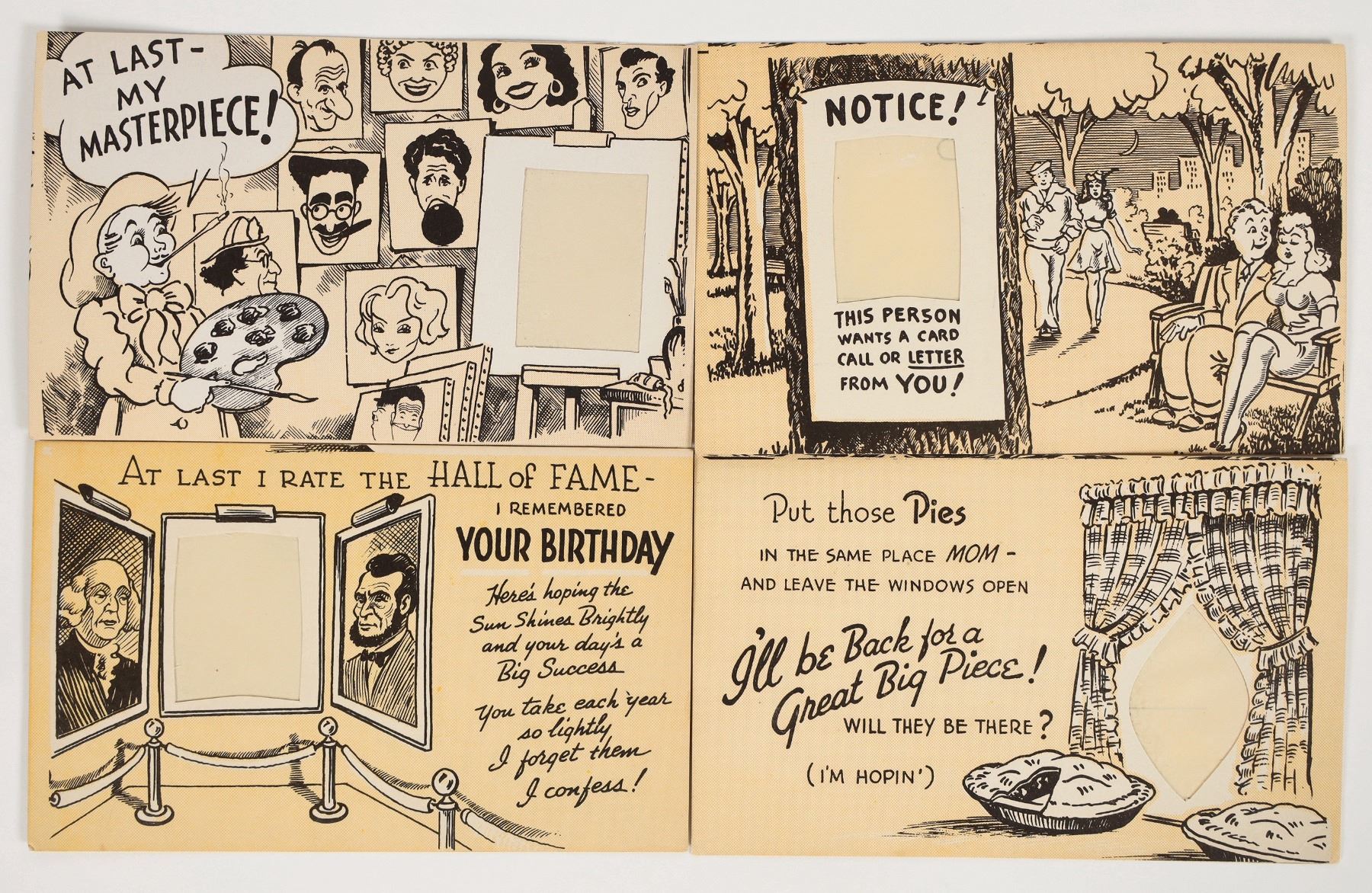 Lot of 4 rare unused photo insert postcards. Each has a slot where you can slide a picture into the front of the postcard to be incorporated into the illustration. No published listed. All different.