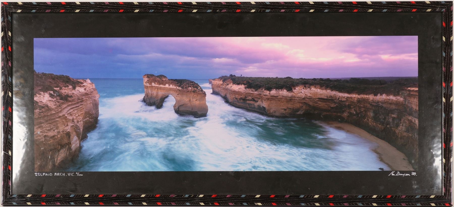 Here is another great piece of photographic art, by the famous Australian photographer...Ken Duncan. It is entitled : " Island Arch, VIc" and is # 11/ 200 produced, and is a very early piece. In the early days, a person could walk right up to the edge of the cliff, and feel the ocean spray on your face. Now, because of government intervention, your view is considerably limited !! Anyway, on this particular day, the artist decided to use a longer exposure. Because of this, he was able to capture the turbulence and power of the water, that created this beautiful coastal arch. 15 3/16" tall and 35 1/8" wide, in a black frame with multi colored diamond shapes. Singed by the artist, perfect condition, and ready to be hung. ( RH)
