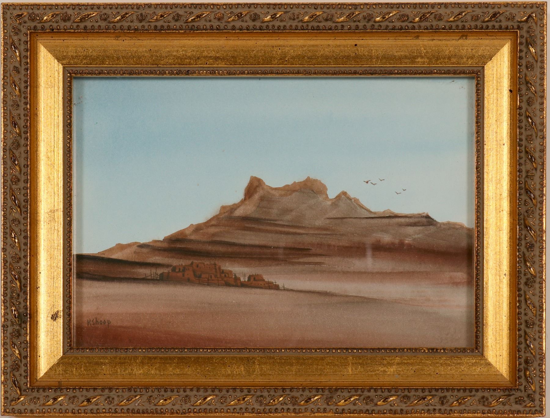 Here is a very nice small item. It is a original, of the native American settlement called " Pueblo De Taos, in New Mexico. They are the best preserved pueblos found north of the border, that was defined the treaty of Guadalupe Hidalgo in 1848. It is also the oldest continued settlement of the Tiwa tribe, in the Americas The artist, K. Shoop, was well know for his work in this area . This rendition is pretty realistic. Perfect condition. Gold painted frame, 5 5/8" high x 7 1/2" wide. Very nice item ( RH).