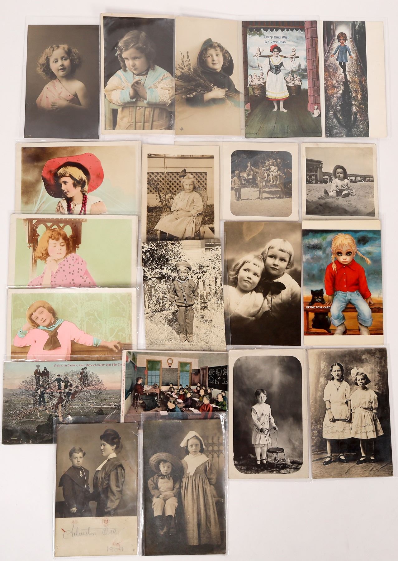 Lot of 20. Nine are RPC's, two Walter Keane studio. Postmarked: Hayward Ca., S.F., Heston KS., Silverton Or. . In protective sleeves.