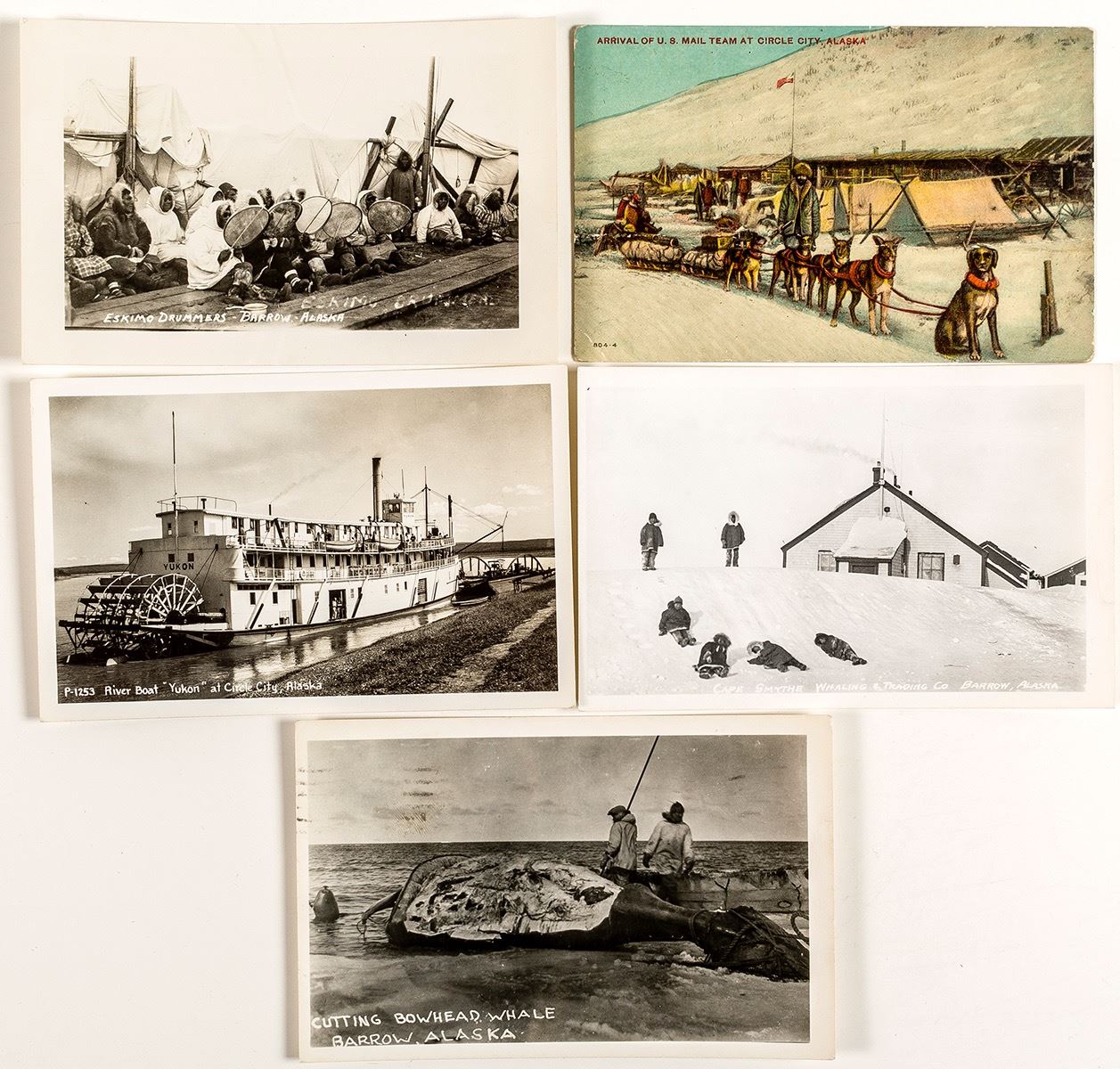 Lot of 5 cards including river boat "Yukon", U.S. mail dog sled team, eskimo drummers, cutting bowhead whale, Cape Smythe Whaling and Trading Co. Date: Location: Circle City & Barrow, Alaska HWAC# 44221