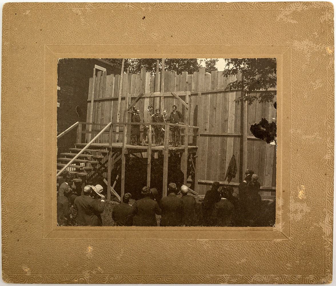 Cabinet card photo of 1903 Oregon horse thief and killer about to be hanged. He is shackled and cuffed standing on the gallows. Man to right has the knotted noose. Back of photo reads, "Property of Alan Andrews...Eugene, Org. 1903 hanging of Elliott Ellis Lyons for the murder of Sheriff W.W. Withers, April 17, 1903. Eugene, Oregon, Lane County" Comes with information from Oregon genealogy and internet sources about the killing and the hanging. Mount is 5.25" x 6.25", photo is 3.25" x 4" State: City: Date: ID# 48954