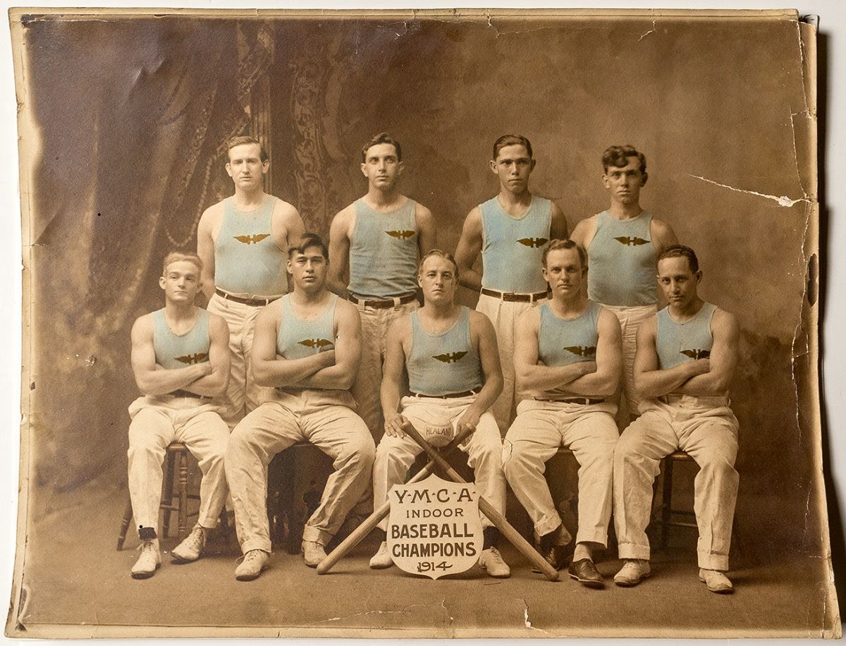 Nice hand colored photograph of a YMCA championship team. 11" x 14". Photo has a few small tears on edges. The Hawaiian baseball league was formed in 1900. In 1914, the U. S. 25th Infantry Regiment--the former Philippine Islands Champions--began a string of four Hawaiian baseball championships. The YMCA and Hawaiian Plantation Owners used baseball for social control and its civilizing influence. It diffused protest and union militancy and helped divert workers from alcohol and prostitutes. It also eased U. S. and Japanese relations. Many Japanese workers were brought to Hawaii and baseball was a common ground. City: State: Hawaii Date: 1914 ID# 29810