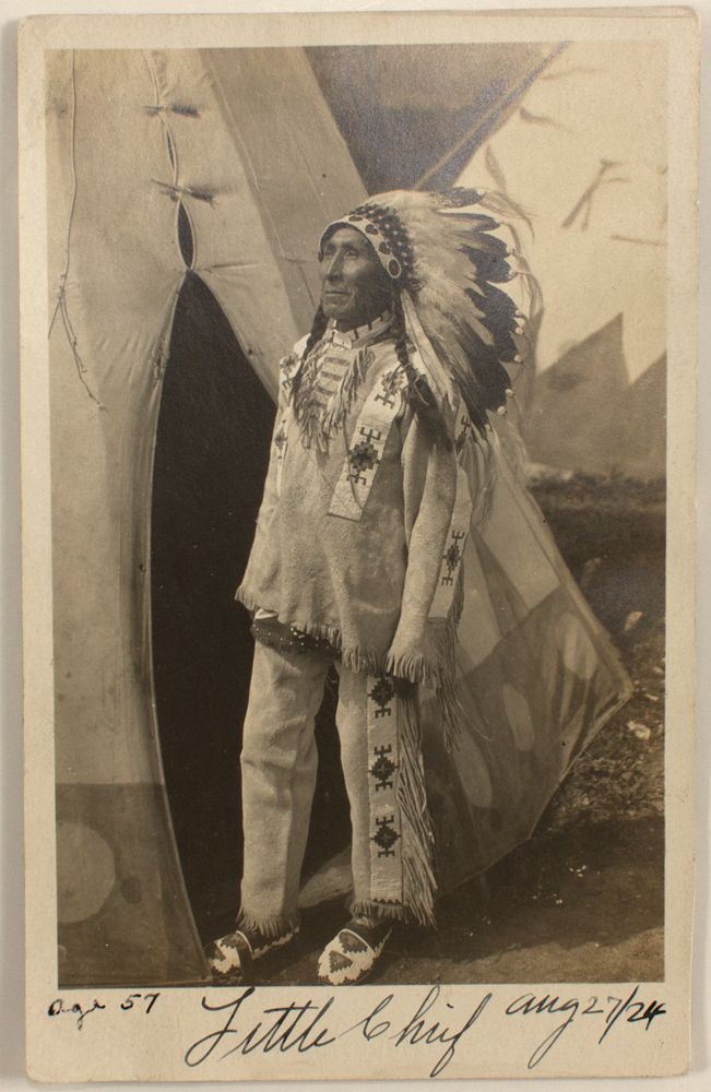 Photo of native American chief identified in handwriting as Little Chief, age 54, and dated Aug 27, 1924. From the Burger collection.
