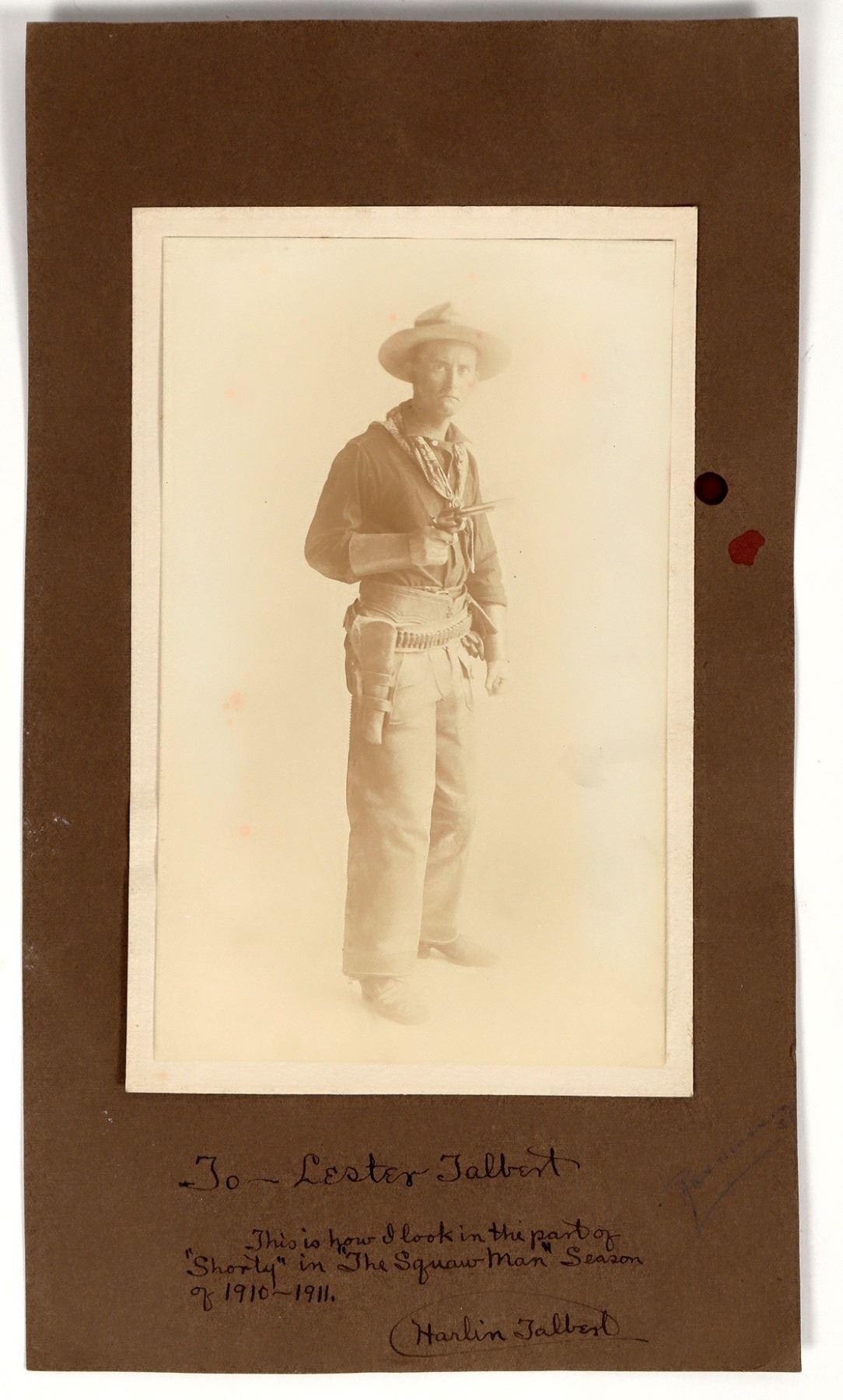 A 5x8 inch sepia photo of "Shorty" mounted on a 7.5x13 card with his signature at the bottom. Talbert was born in Albany, Oregon in 1887. When he was twenty-two, in 1909, he moved to Chicago to "get into the theatrical business." One of his first roles was "Shorty" in 1910. The "Squaw Man" must have been a series of short films, as there is no mention of it in the usual search sites. In 1914 Cecil B. DeMille's first film was released. Titled "The Squaw Man" it is famous as Hollywood's first feature-length movie. Until 1929 Talbert worked with stock and vaudeville companies, and in theater and motion picture promotion as an actor, advance man, business manager and partner. He later promoted theatrical events in Albany. His papers are now on file at the University of Oregon at Eugene.