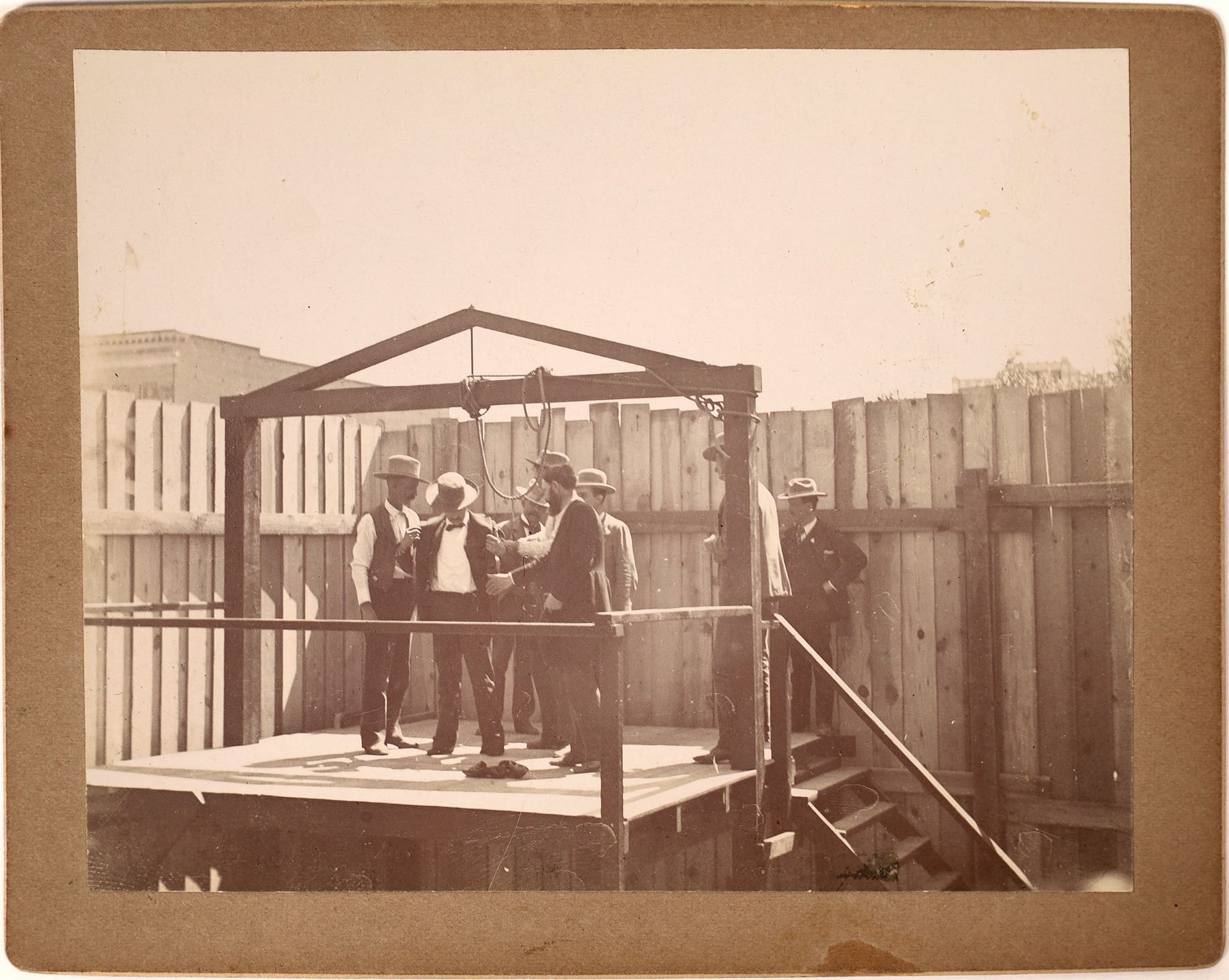 A photo taken by H.L. Hamaker of the execution of Fleming Parker. In February 1897, James Fleming Parker, along with an accomplice, robbed a train outside of the settlement of Peach Springs, Arizona Territory. The robbery was a failure because the accomplice died from his wounds and Parker lost the stolen money. He was hunted by a posse for 8 days in the area of the Grand Canyon led by Yavapai County sheriff. He was eventually captured and placed in the Prescott Jail. One of his fellow prisoners was Louis Clair Miller, a forger and one time candidate for Yavapai County sheriff. The two soon escaped from jail and, in the process, Parker shot and killed the prominent Prescott resident and district attorney E. Lee Norris in the courthouse square. A bounty was posted for their capture - dead or alive. The two were soon captured and tried for murder (Miller was named as the accomplice). Miller missed the death penalty by one vote. Parker was sentenced to death and hanged in the courthouse square. He was buried in Potter's Square in the Citizens Cemetery. On the day of hanging, in lieu of a last meal, Parker requested a visit from Flossy, his favorite Whiskey Row lady, which was granted. The two of them spent an hour together.