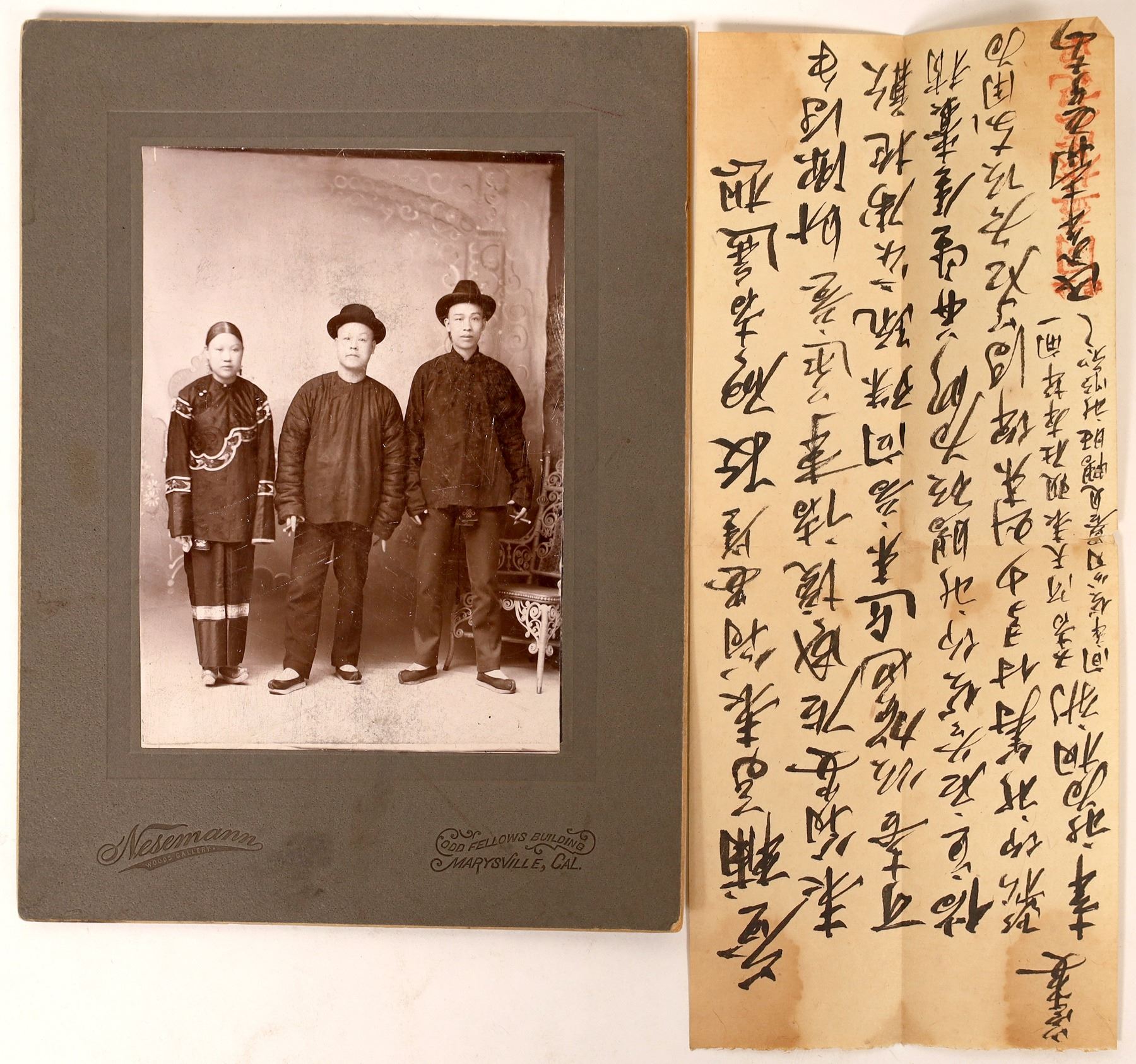 Professional framed photo of three Chinese individuals from Nesemann Woods Gallery. 1945, Odd Fellows Building Marysville Clair. Phot was found after the fire of the “Old Joss House”. Excellent condition..