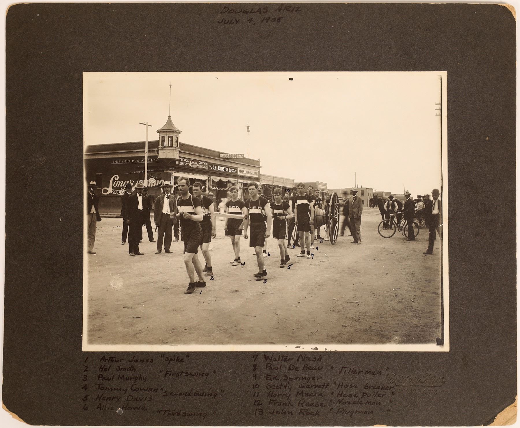 A nice vintage photo of the Tombstone, Arizona Territory, fire dept. marching in a Fourth of July parade in Douglas in 1905. The photo measures 8.5"x 6.5" and 12"x 10" in its matting. A list of the participants are handwritten across the bottom of the photo matting. Nice clear photo. Please see photos for more detail and condition.