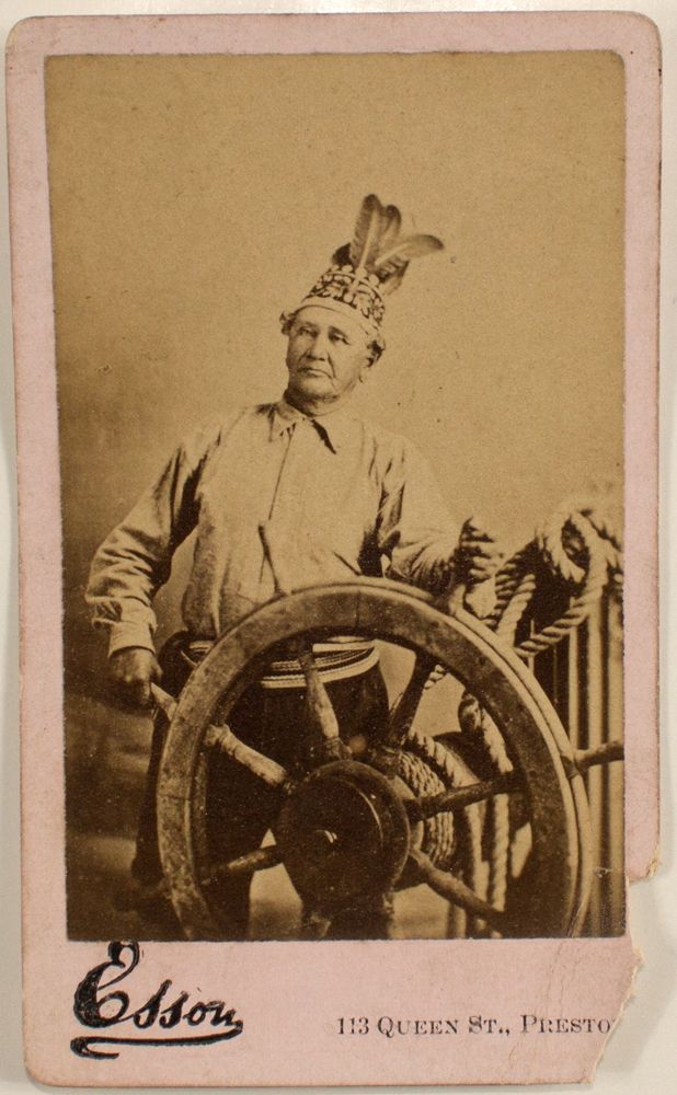 Studio photo of native in headdress (probably Pacific island) at helm of ship. From the Burger collection.