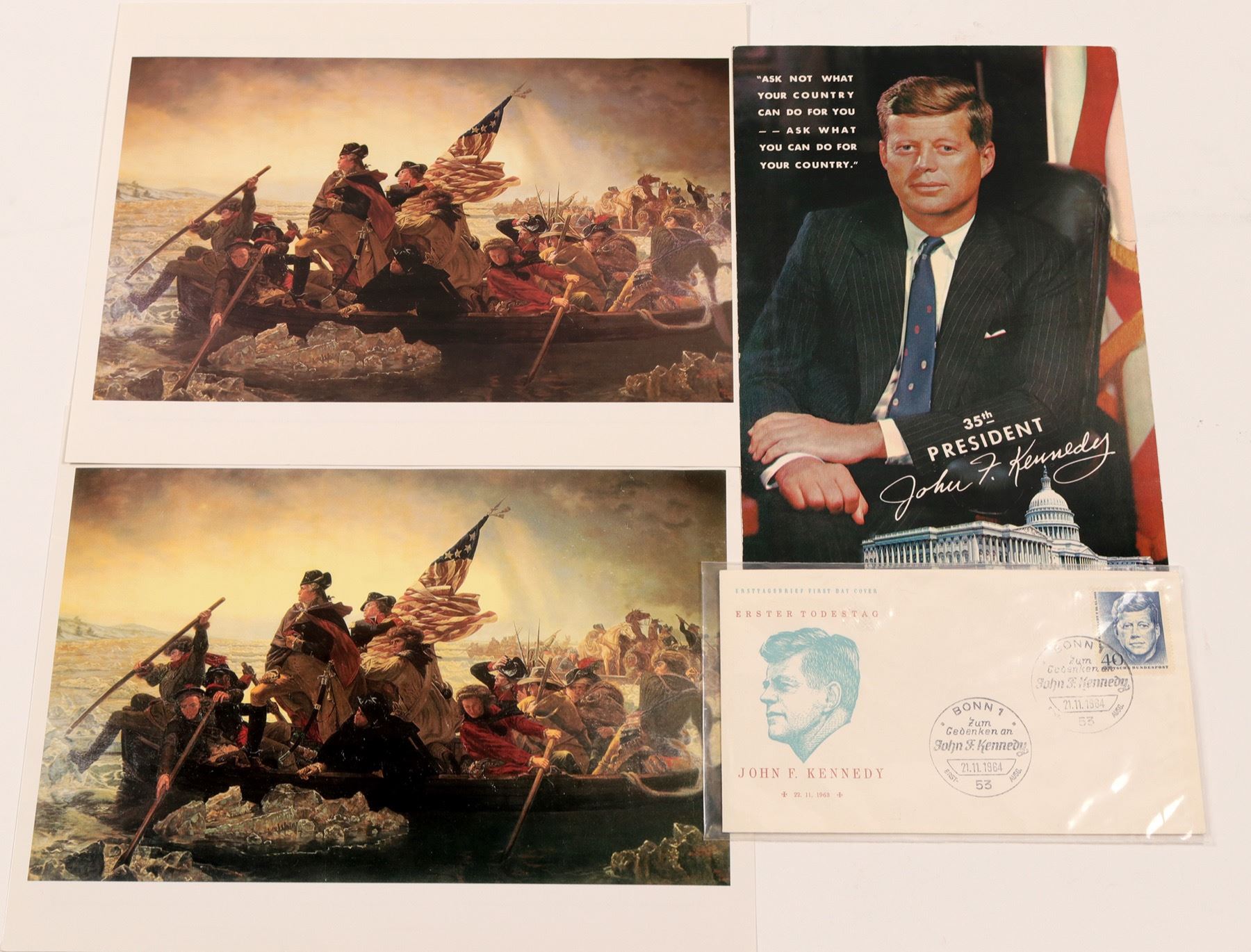 Item # 1 of 4 : Beautiful, 9" high x 6" wide, multi-colored postcard of John F. Kennedy. From his famous " Ask Not Speech". Nice picture of the White House below. Item # 2 of 4: Really nice , commemorative First Day Cover of President Kennedy,marked Bonn from Germany, 11-21-1964. Nice side view, and great stamp. Items #3 & #4 of 4: ( 2 ) Very fine color photos, of Washington Crossing the Delaware, which was originally painted by Edmund G.Leutze ( 1816-1868), in 1851. Complete biography on the reverse. Outstanding. Nice grouping of presidential items. ( RH ).