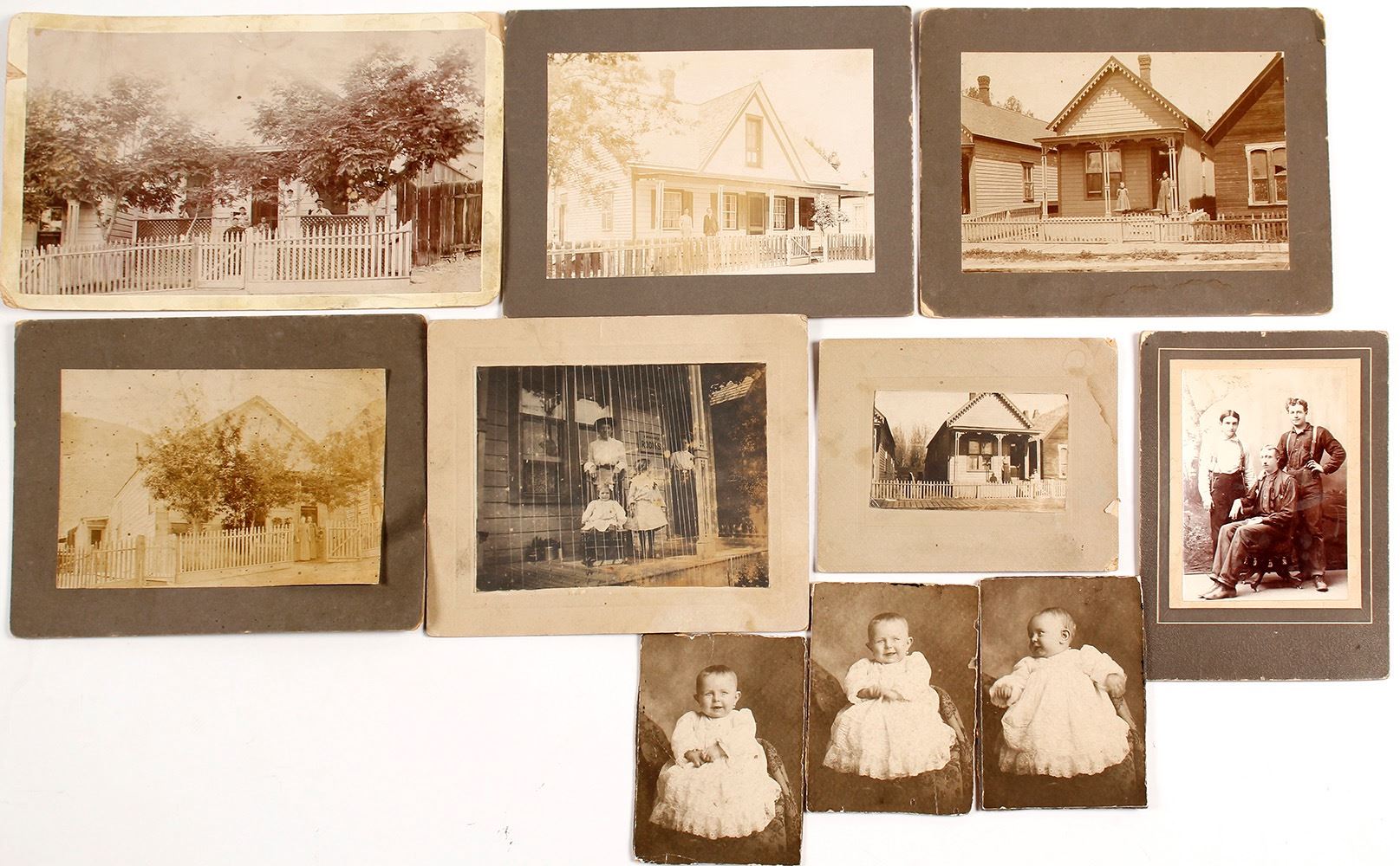 Lot of ten different photographs showing either the Ayer family or their house that was located on the "Divide," between Gold Hill and Virginia City, Nevada. 1) Five are of people posing in front of two (?) different houses, either identified as "Mama's House" or "Aunt Rosies" on the Divide. Smallest is 4x5", largest is 5.25" x 8.5". Chips and soiling. Please inspect. No photographer listed. 2) Five other Ayer family pictures: 3 show a baby and are identified as "Dad" in 1906; one shows three gentleman posing in a studio; and the last shows women and children on porch of hotel/boarding house and is identified as "Mom's in Virginia City-Gold Hill." Provenance: Ayer Family Estate. Please see other Virginia City, Gold Hill, and Reno photographs from this family collection. Date: Location: Virginia City, Nevada HWAC# 55522