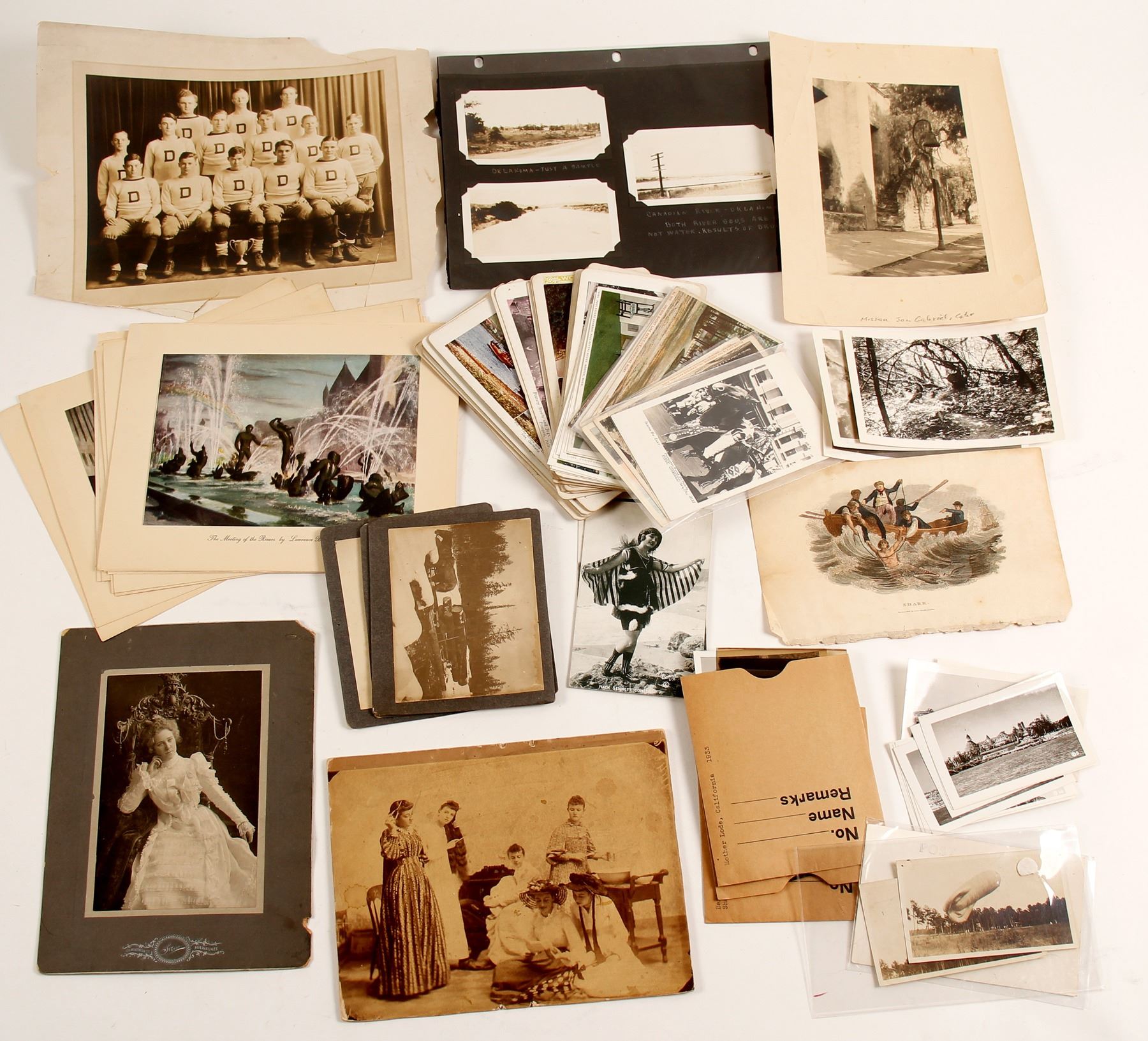 Approx- 40 b/w photos of Americana, lumbering and mining, some with negs.10 color prints 5x7". 20 European scene stereoviews. 10 postcards with 2 RPC's
