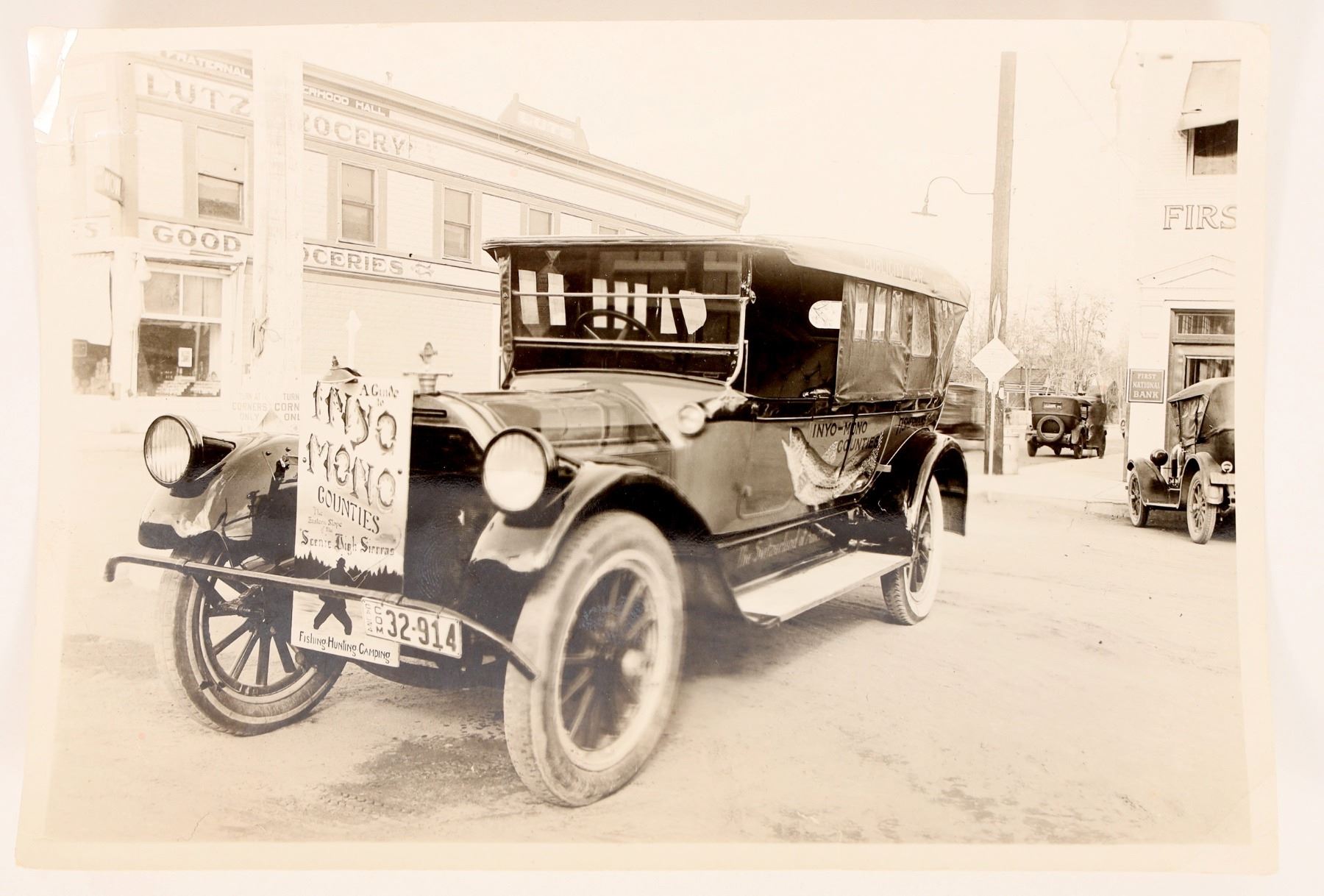 A black and white photograph of a 1920s automobile dressed up to promote Inyo and Mono counties in California. The vehicle is parked on a street with Lutz Grocery and First National Bank in the background. It has signs on the front and driver's side advertising what appears to be guided tours of the two counties. Signs read: "A Guide to INYO MONO counties, the Eastern slope of the scenic High Sierra, Fishing, Hunting, Camping"; and a large trout is painted on the side with "INYO-MONO COUNTIES" above it and "The Switzerland of America," below. "Publicity Car" is painted above the side window. 7" x 5".[ Bishop California