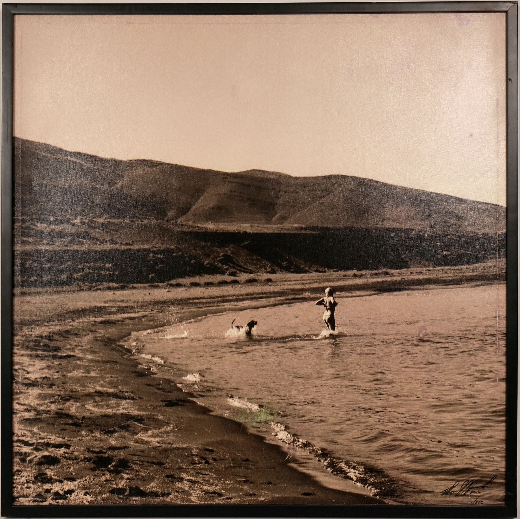Enlarged photograph of Marilyn Monroe in Pyramid Lake while filming The Misfits, her last film. The image is printed on canvas in blck and white, framed: 31" x 31". Good condition, some slight staining in sky. Original photograph, 1961.