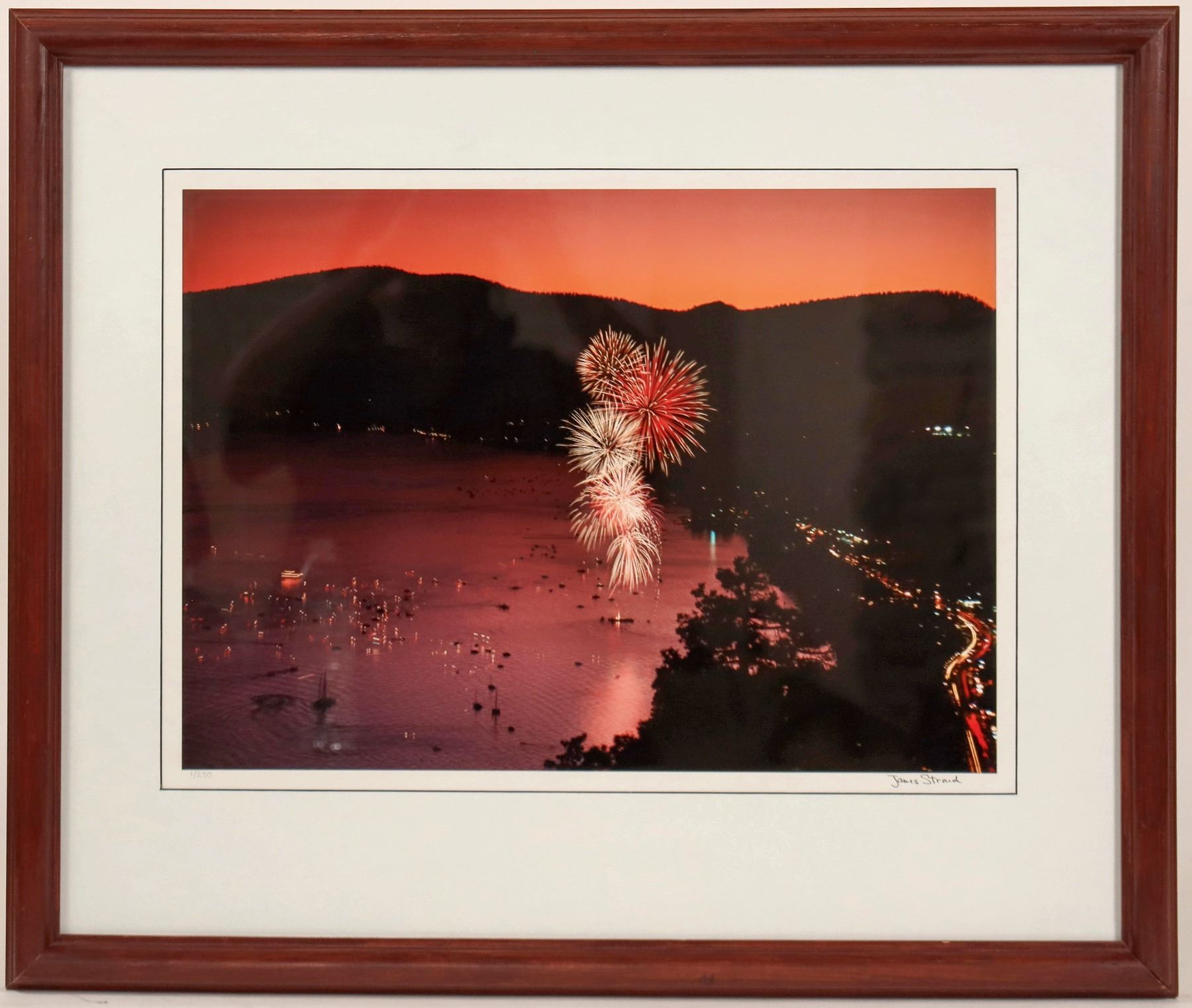 Fireworks over water, photo by James Stroud. 1/250. Framed, approx. 23" x 27".