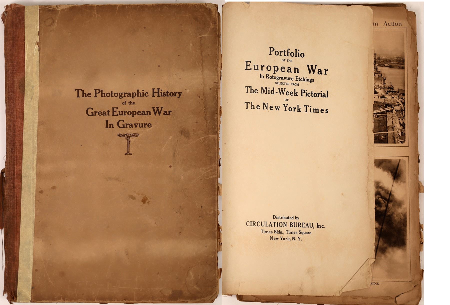Published by the New York Times, hundreds of pages of photographs from World War One. The 11 x 16-inch album is an inch thick and has been heavily viewed. The cover is partially detached, and the newsprint page edges are frayed; but all photos are legible and historical.