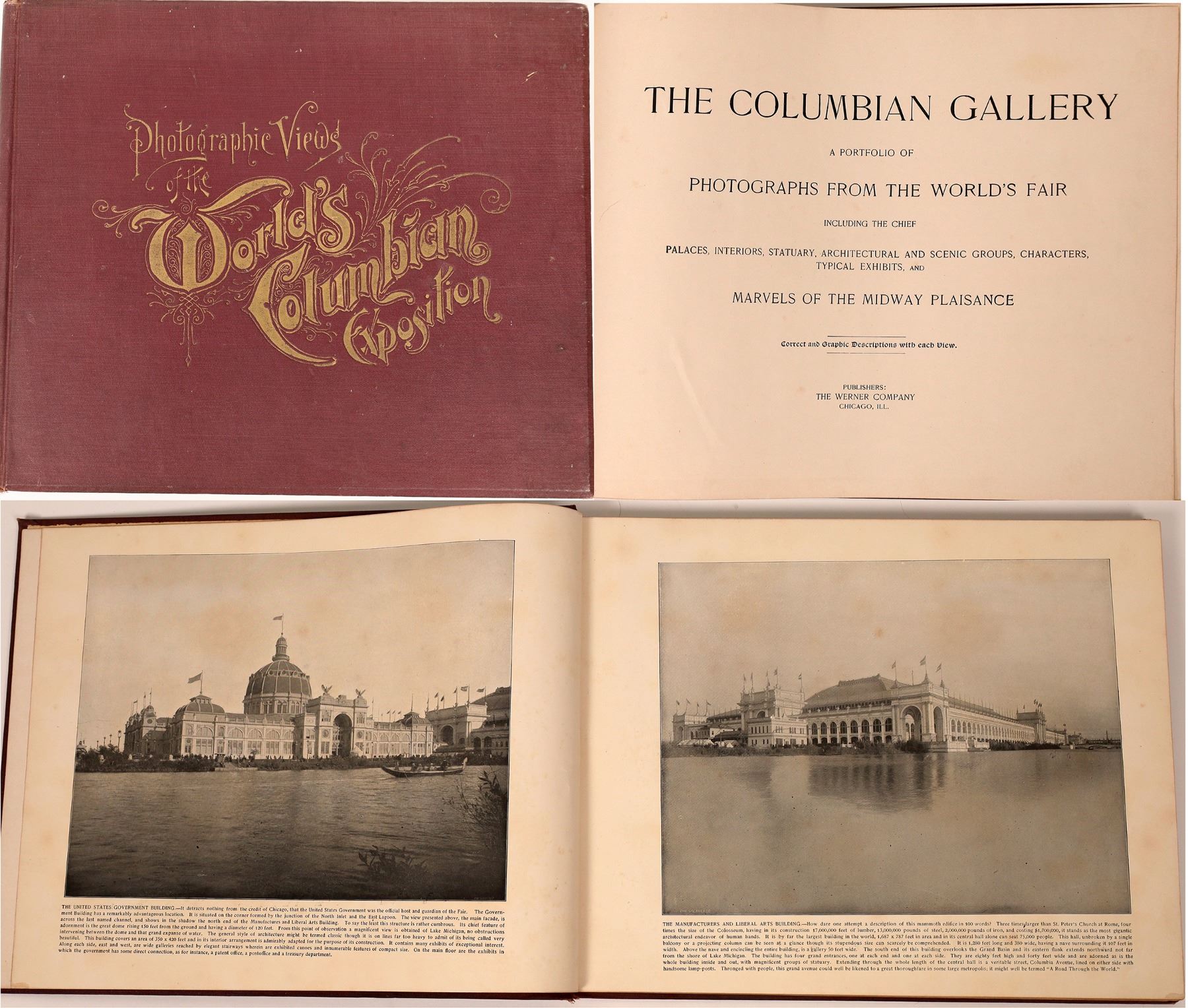 "The Columbian Gallery A Portfolio of Photographs from the World's Fair including the chief palaces, interiors, statuary, architectural and scenic groups, characters, typical exhibits and Marvels of the Midway Plaisance." Published by the Werner Company of Chicago, 1894. Book is 11 x 13 inches, about 200 pages of B&W photos. State:Illinois City:Chicago Date:1894 Provenance: Salvatore Falcone Collection