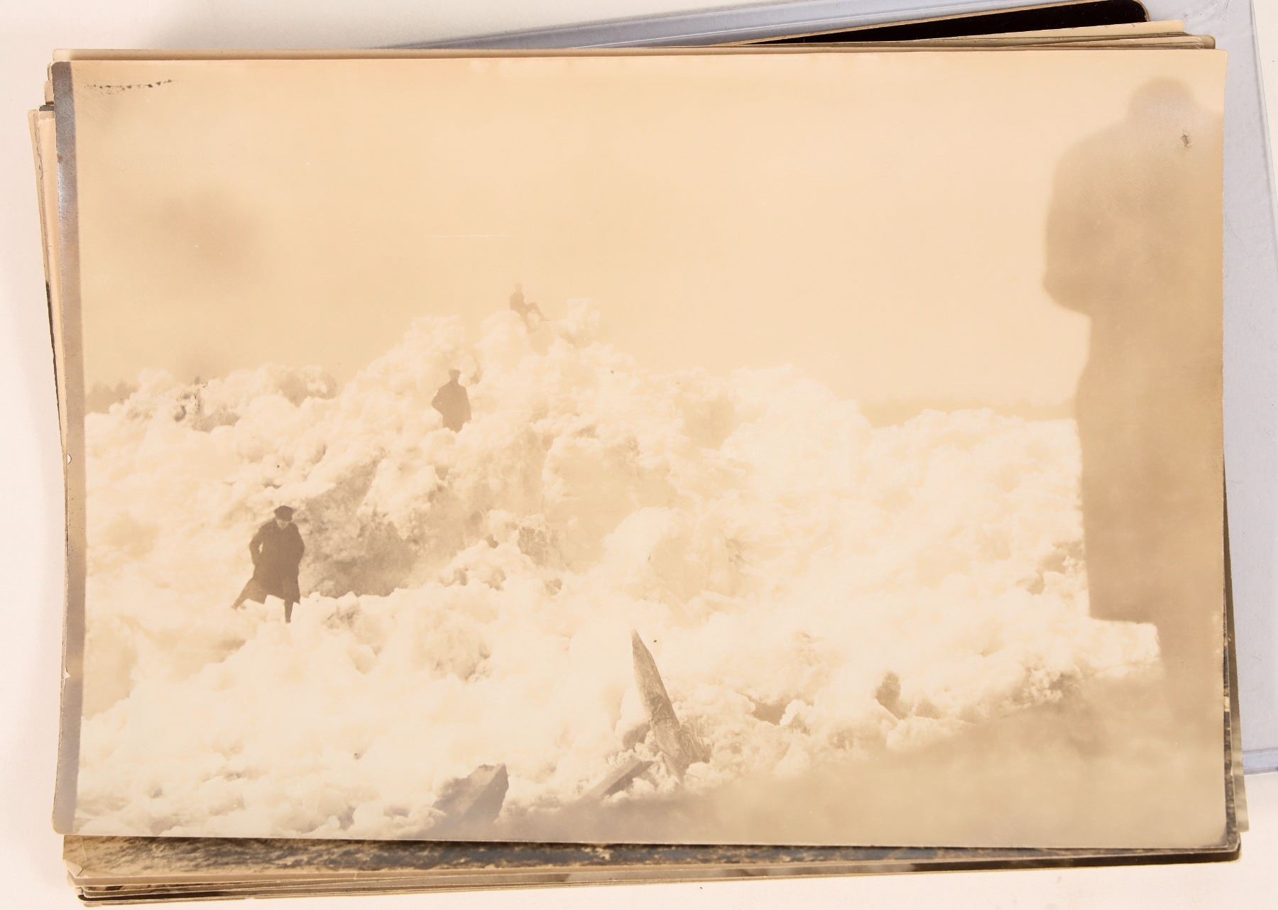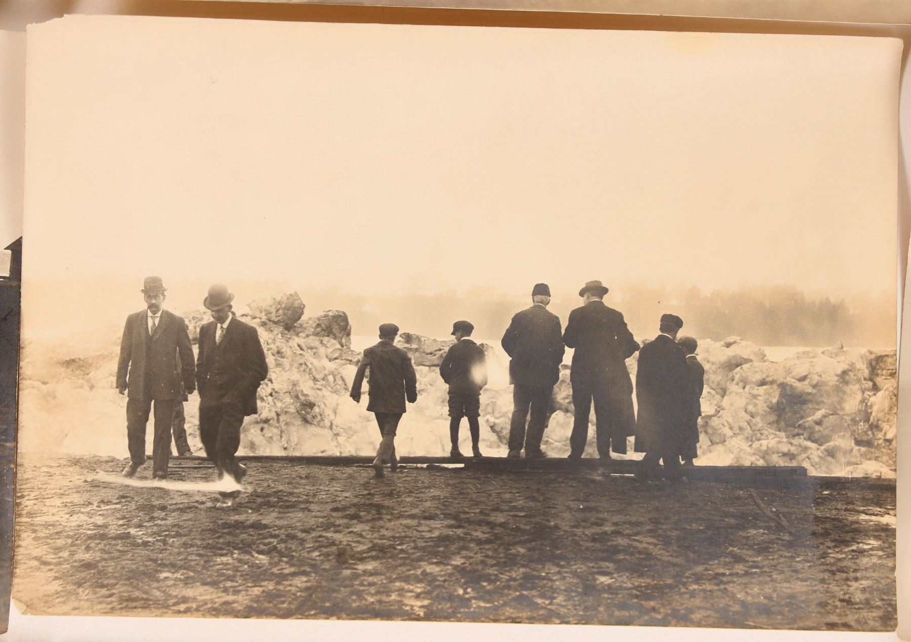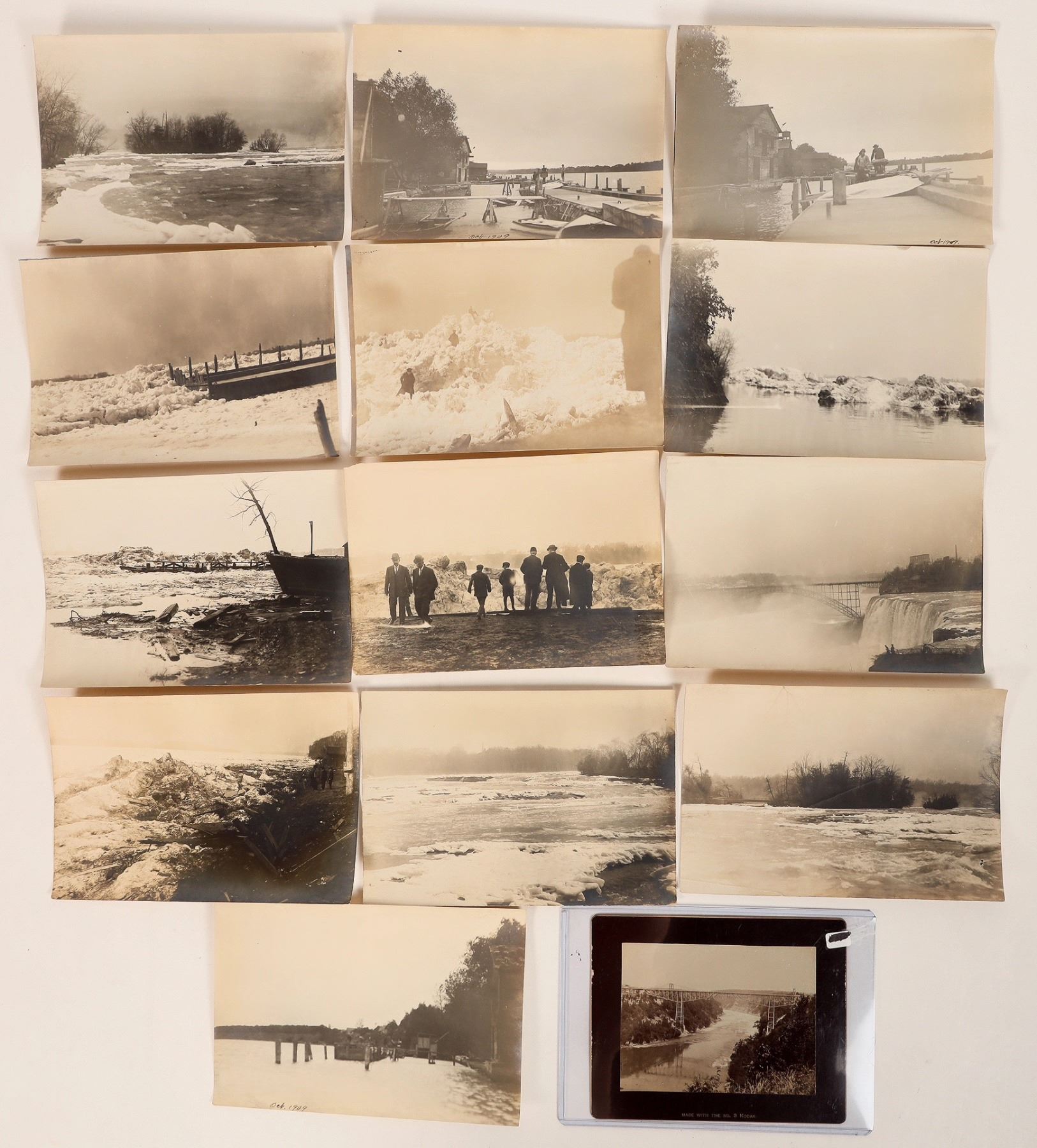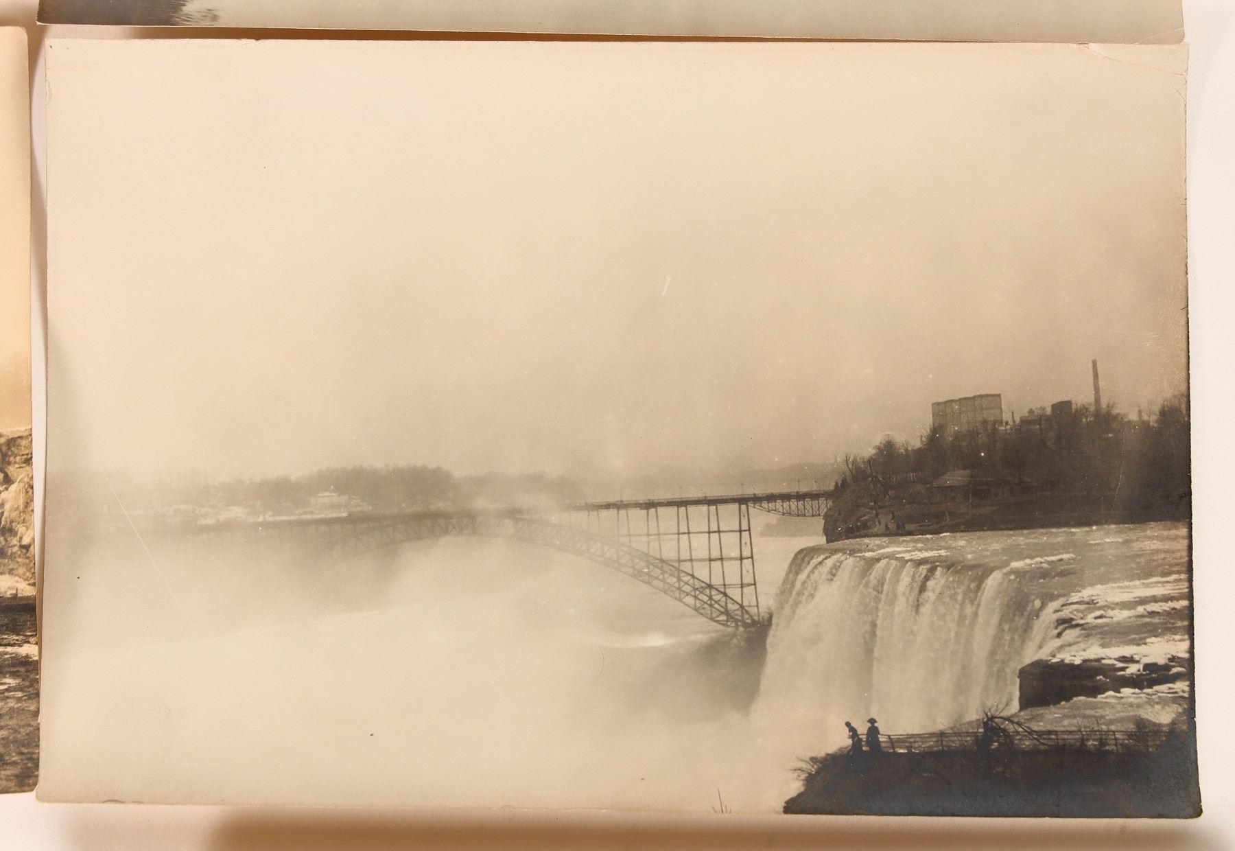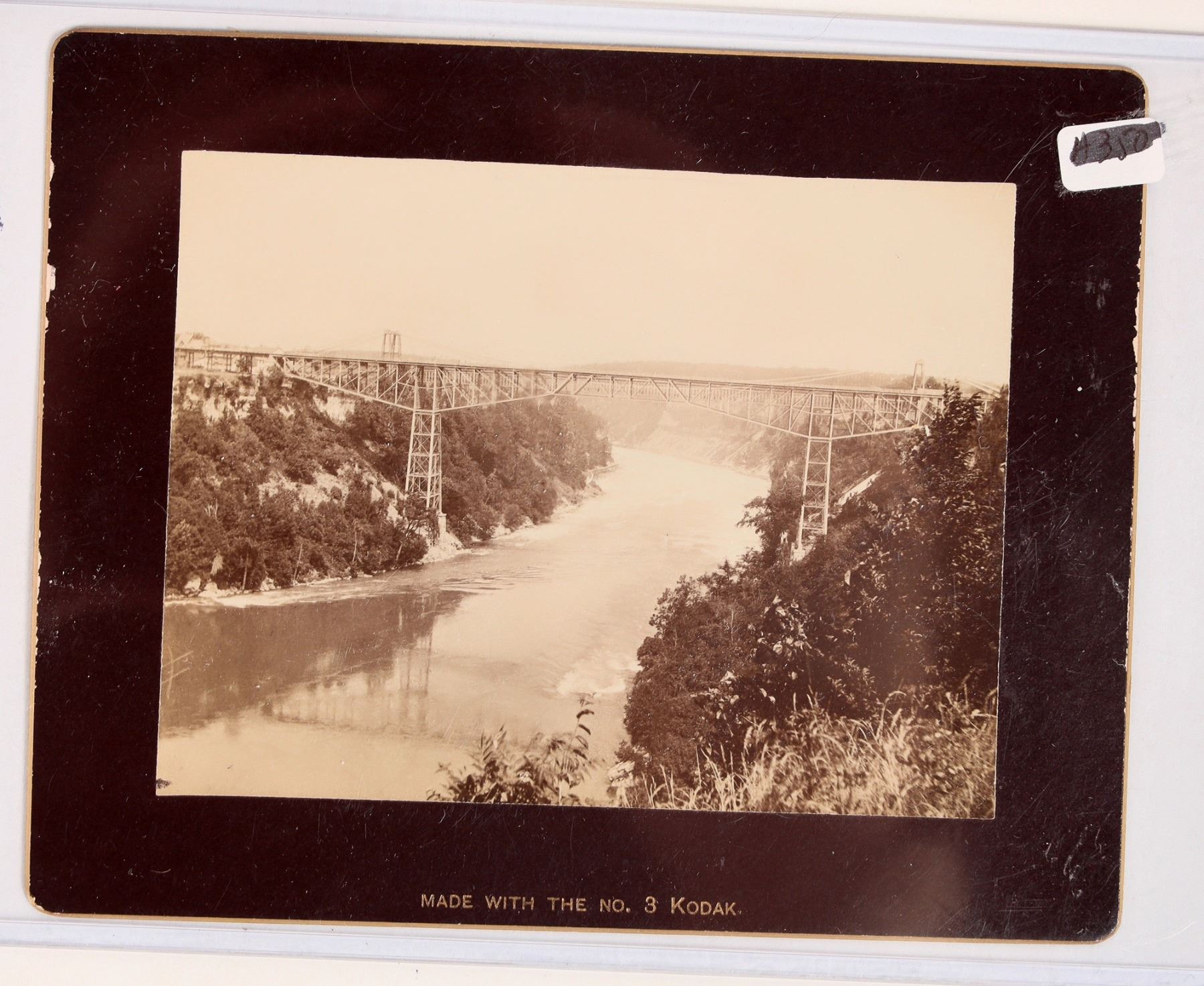 Collection of 15 photographs of the Niagara Falls and Great Lakes region, c1909. Includes a 5" x 4" photograph of the Niagara Cantilever Bridge across the Niagara Gorge, on Eastman Company photographic card stock, "Made with the No. 3 Kodak" printed in gold below the photo. The cantilever bridge opened to traffic in 1883 and was replaced by the Michigan Central Railway Steel Arch Bridge in 1925. Other photographs include a severe winter at the Great Lakes near Niagara Falls, possibly near Buffalo.[ Niagara Falls New York