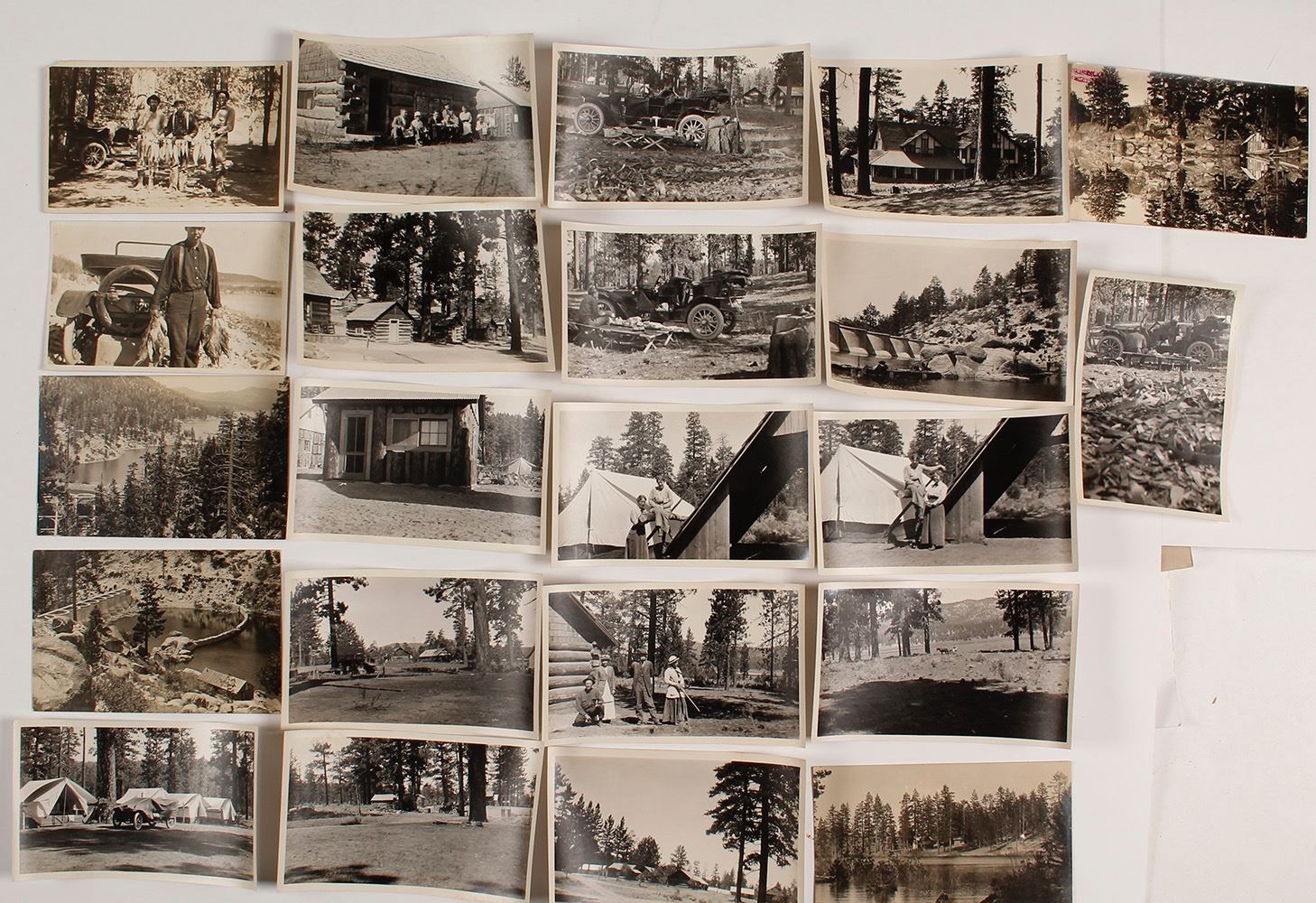Lot of 19. Six real photo postcards (two mailed,1914, East Highlands cancel) and 16 black and white photographs (3.5 x 5.5"). Show people enjoying a vacation at a lakeside cabin, including shots of fishing, early automobiles, picnics, tent camping, a dam, lake views, etc. One postcard says "this is the cabin...it is in the water now..the water flows over the old dam." (Prag Collection) Date: c.1914 Location: East Highlands, California HWAC # 55646