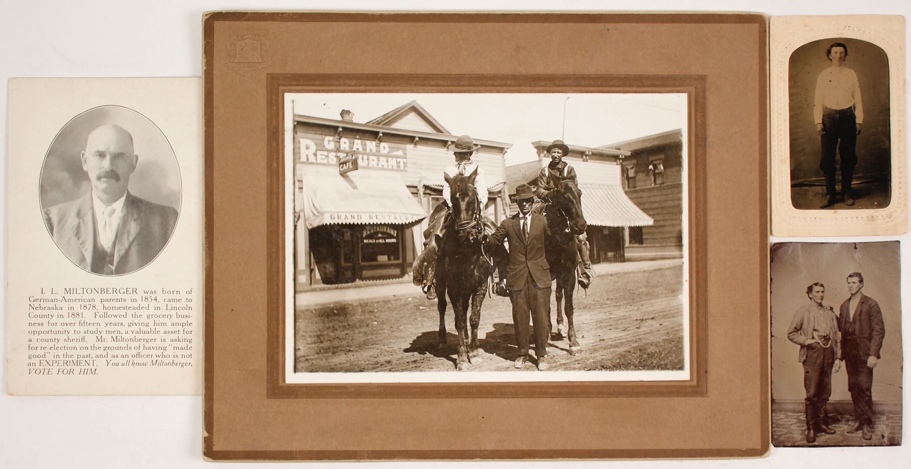 Lot of 4. 1) Mounted photograph of Idaho cowboys on horseback, posing in the middle of the street with another man. Photo has a Montpelier stamp in the upper left corner. Likely c. early 1900s. 5 x7" on 7.5 x 9.5" mount. Nice contrast. 2) Photo campaign postcard of I.L. Mitlonberger, running for re-election as sheriff in Lincoln County, Nebraska, 1909. 3) Two tintypes: one shows a farmer/rancher and the other shows two men in knee high boots, c.1870s.