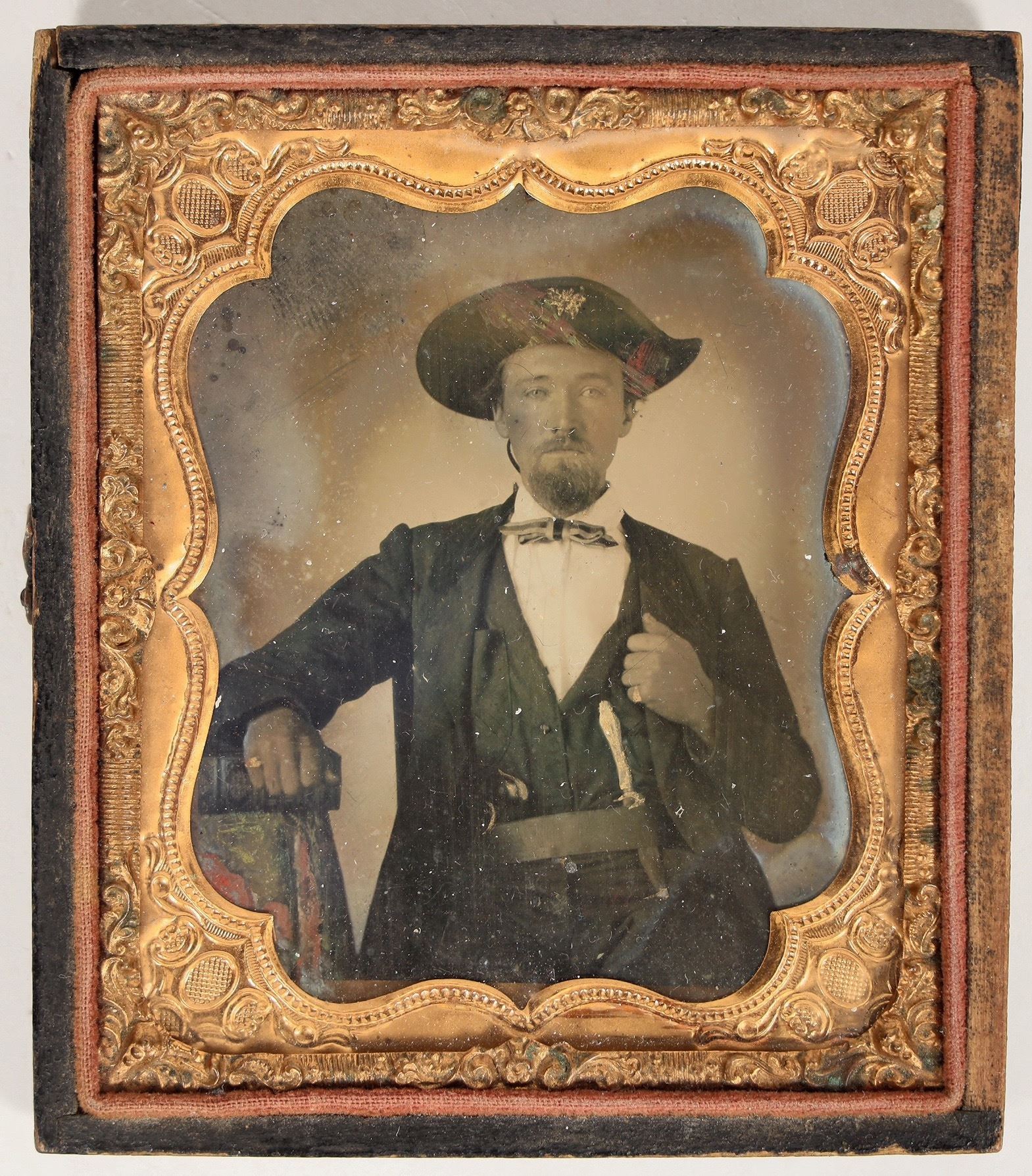 This Ambrotype photo is of William Thomas "Bloody Bill" Anderson (1839-1864). Very few photos exist of him while alive and likely taken before 1863 or 1864. He is shown with his familiar hat with star. He was also known to wear a beard and well dressed. He also wears two pinky rings, one on each hand and the star on his hat colorized in the photo.