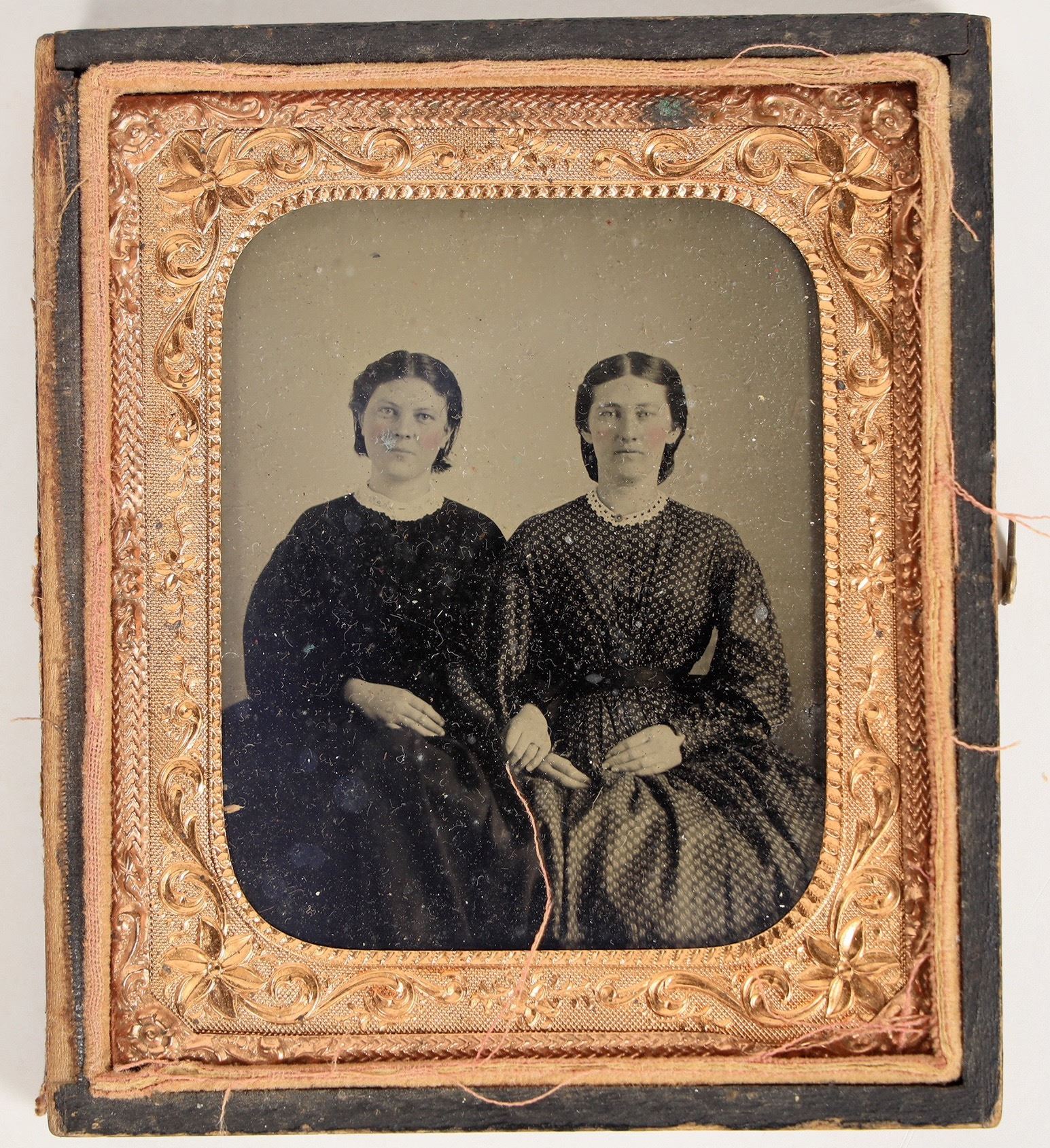 This Tintype photo of two women are thought to be the two surviving sisters of Bloody Bill Anderson. Mary Ellen "Molly" Anderson (1845-1903) is on the right. Younger sister Martha Jane "Mattie" Anderson is on the left (1852-1926). Both girls sustained injuries from the Kansas City jail collapse in 1863. The photo was likely taken late in 1864 or early 1865. Both women would be married in 1865 and 1867 and neither woman wears a wedding band in the photo.