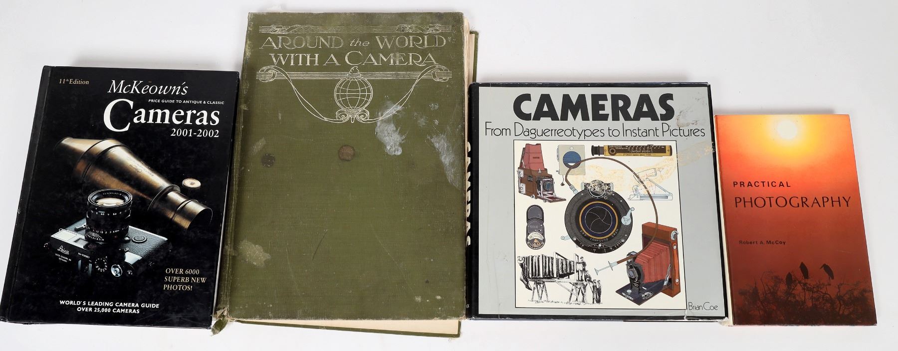 4 hardcover photography books. Practical Photography by McCoy, 2001-02 Price Guide to Cameras by McKeown, Cameras by Coe, Around the World with a Camera by Schleicher 1918-binding detaching but has lots of great period photos.