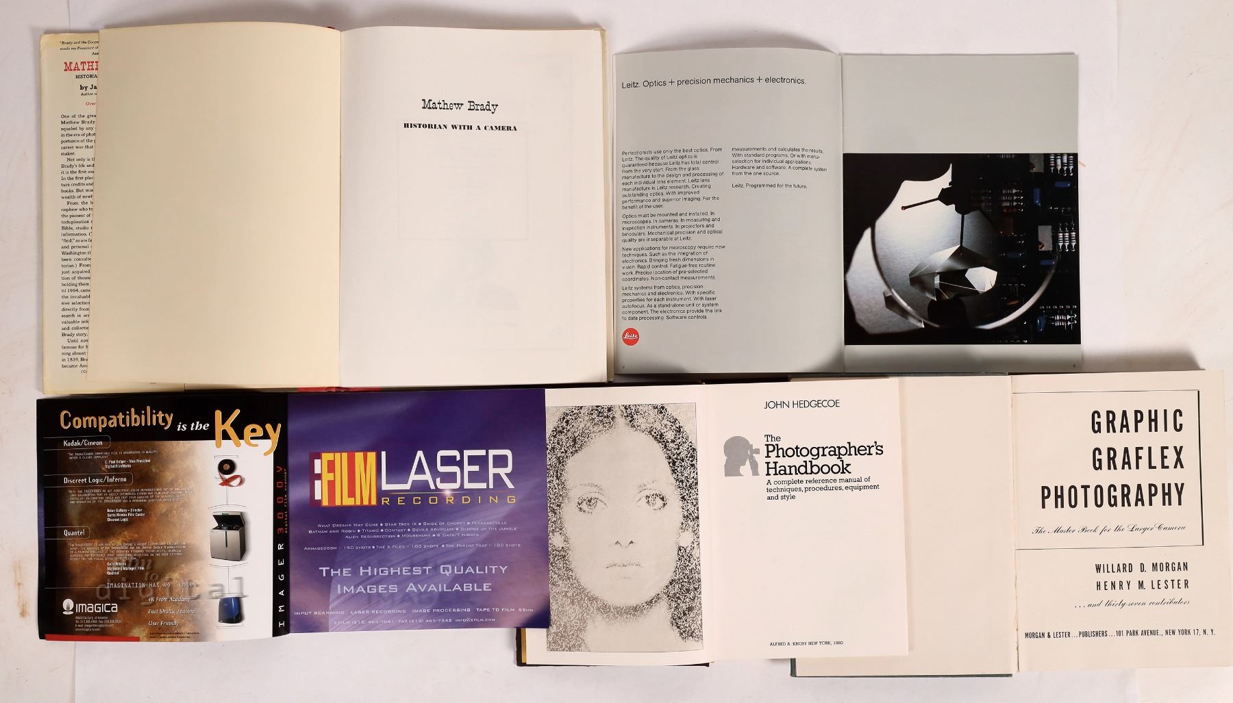 Lot of five books about photography and visual effects. Titles include Mathew Brady: Historian With a Camera by James D. Horan. Cinefex: The Journal of Cinematic Illusions, The Photographer's Handbook by John Hedgecoe, Graphic Graflex Photography by Willard D. Morgan and Henry M. Lester, and a magazine for Leitz cameras. Largest book is 9.25 x 12.25 inches.