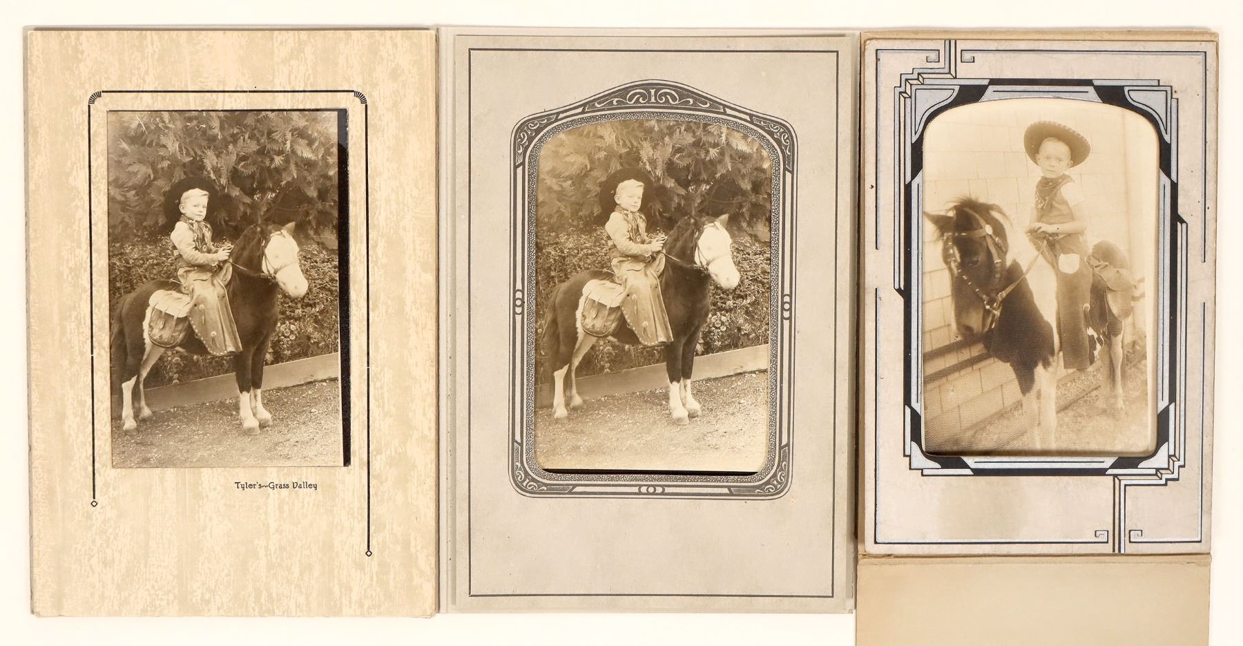 Three framed photos of a five year old in full leather cowboy outfit, saddle bags early 1900's . Frames are 5x7 " cardboard.