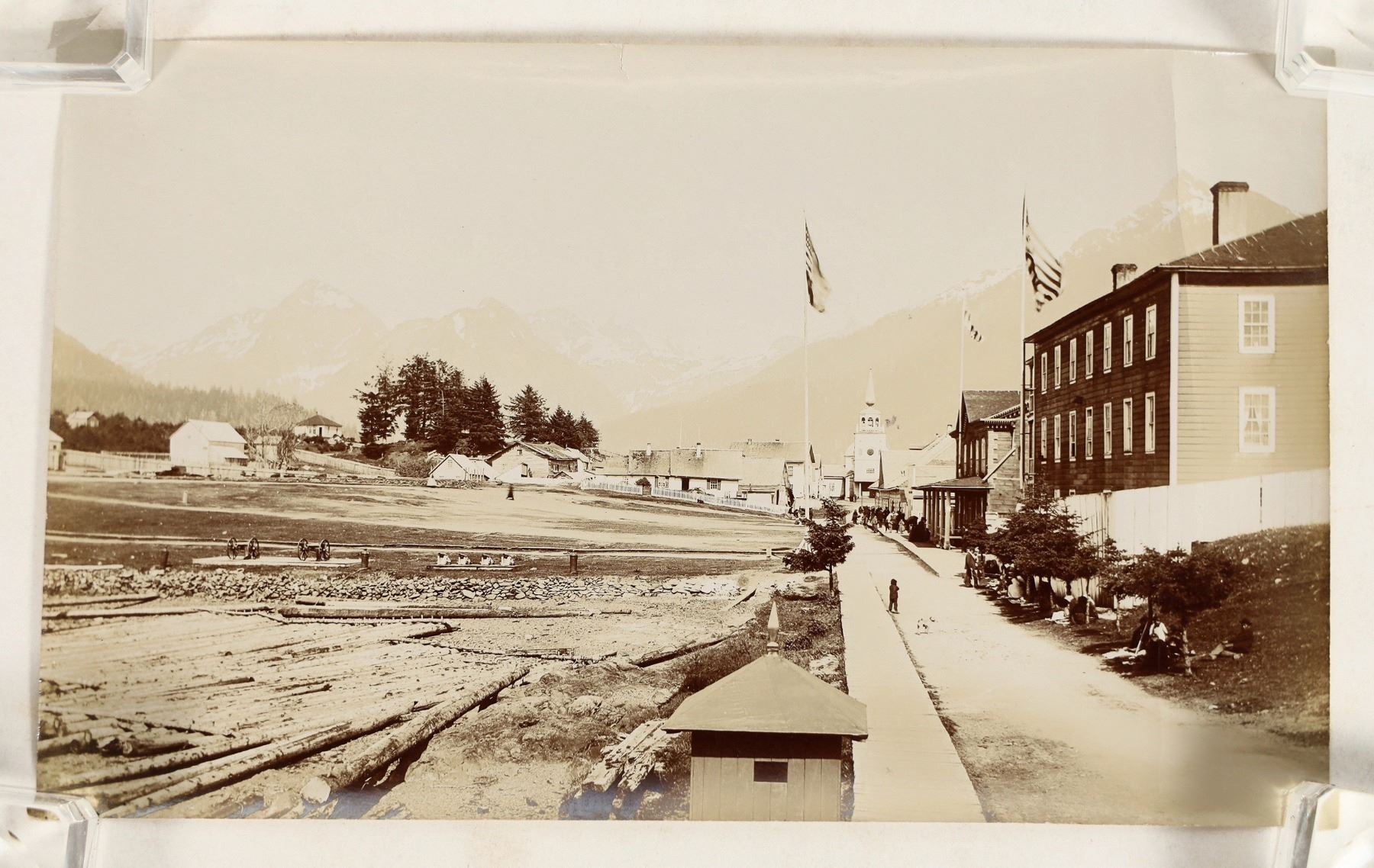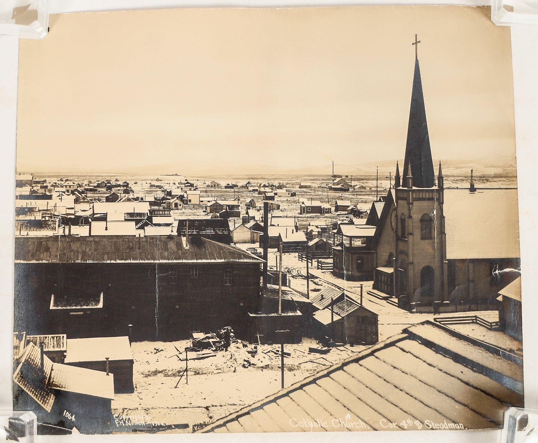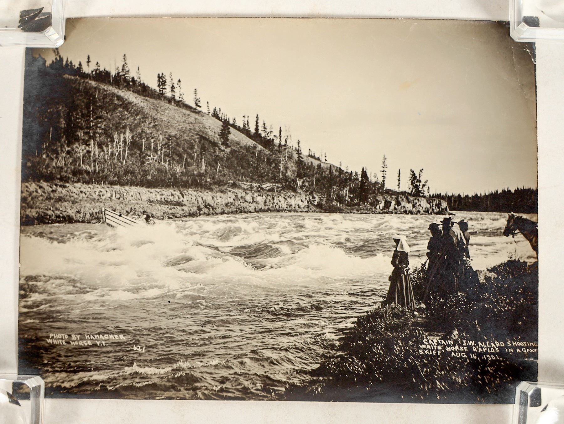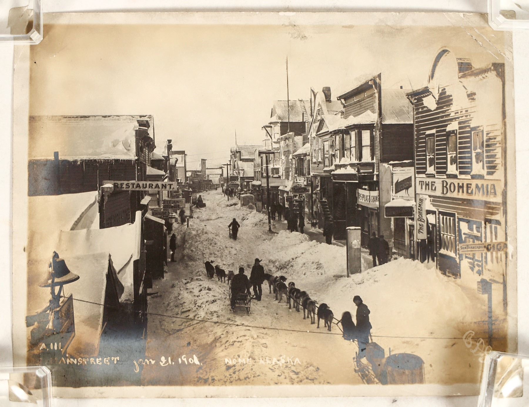 Lot of 5. Original (one reprint) B/W , 5 x8 to 7.5 x9.5 photos of various Alaskan street views: Main St Sitka, Main St Nome, Ketchikan, boat shooting White Horse Rapids and Dawson Y.T. (reprint).