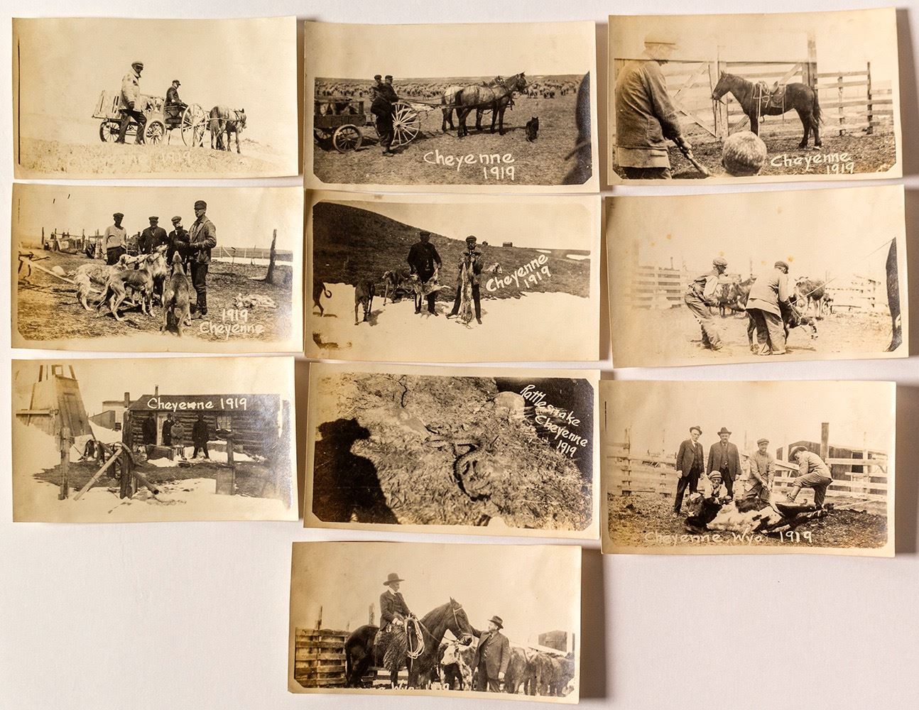 Ten photos of cattle and sheeping ranching in Cheyenne, Wyoming in 1919. A rattlesnake poses for one of the pictures. Photos are 4 1/2 x 2 1/2 inches. City: Cheyenne State: Wyoming Date: 1919 HWAC# 52416