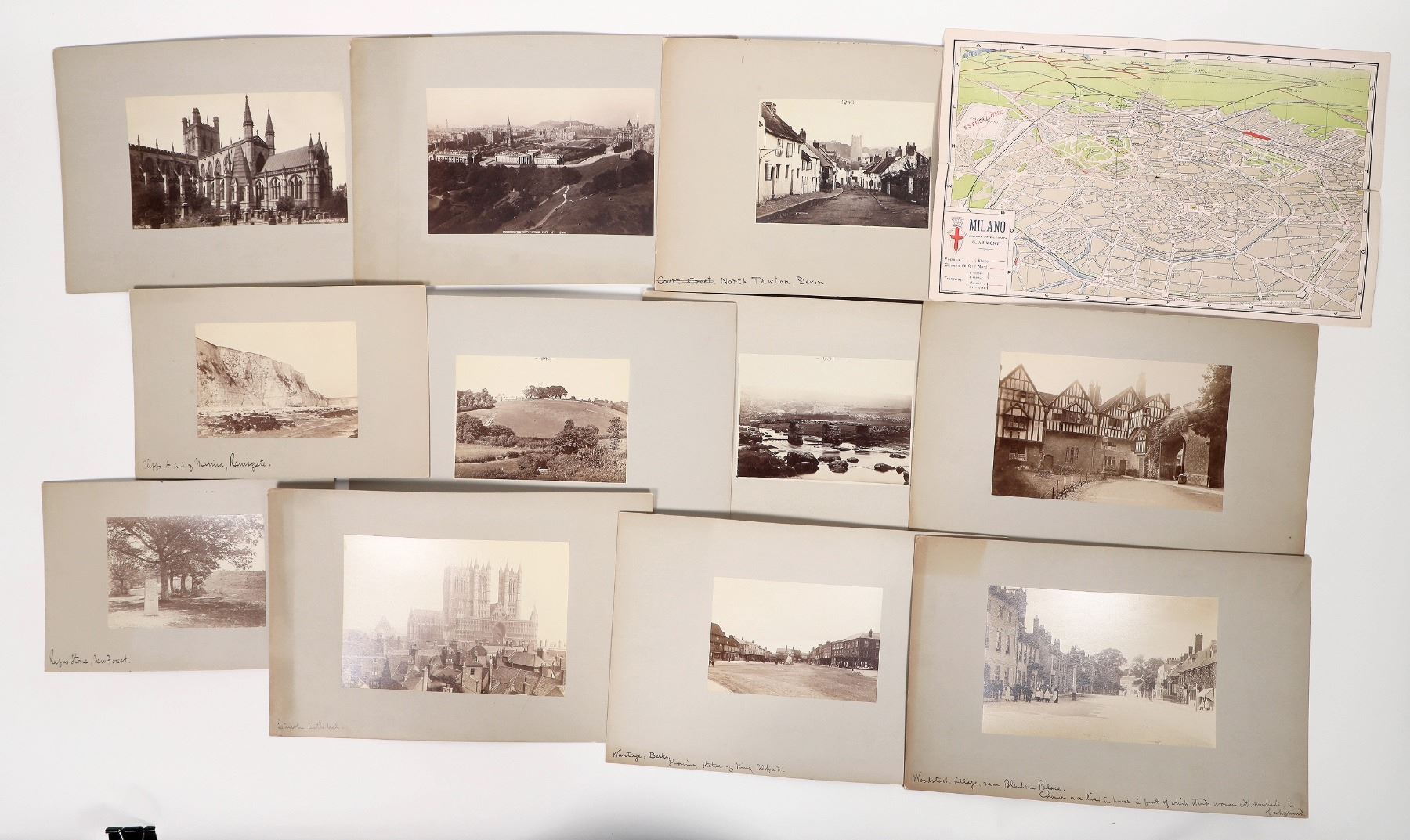 A dozen (12) mounted black & white photos of various landmarks and locales in the British Isles. Included is a photo of the Rufus Stone which is purported to be the spot where William II was killed in a hunting accident in 1100. Also included is Chester Cathedral in Buford, Edinburgh Castle and more. The sizes of the photos vary, but they are clear and sharp. Please see photos for more details.