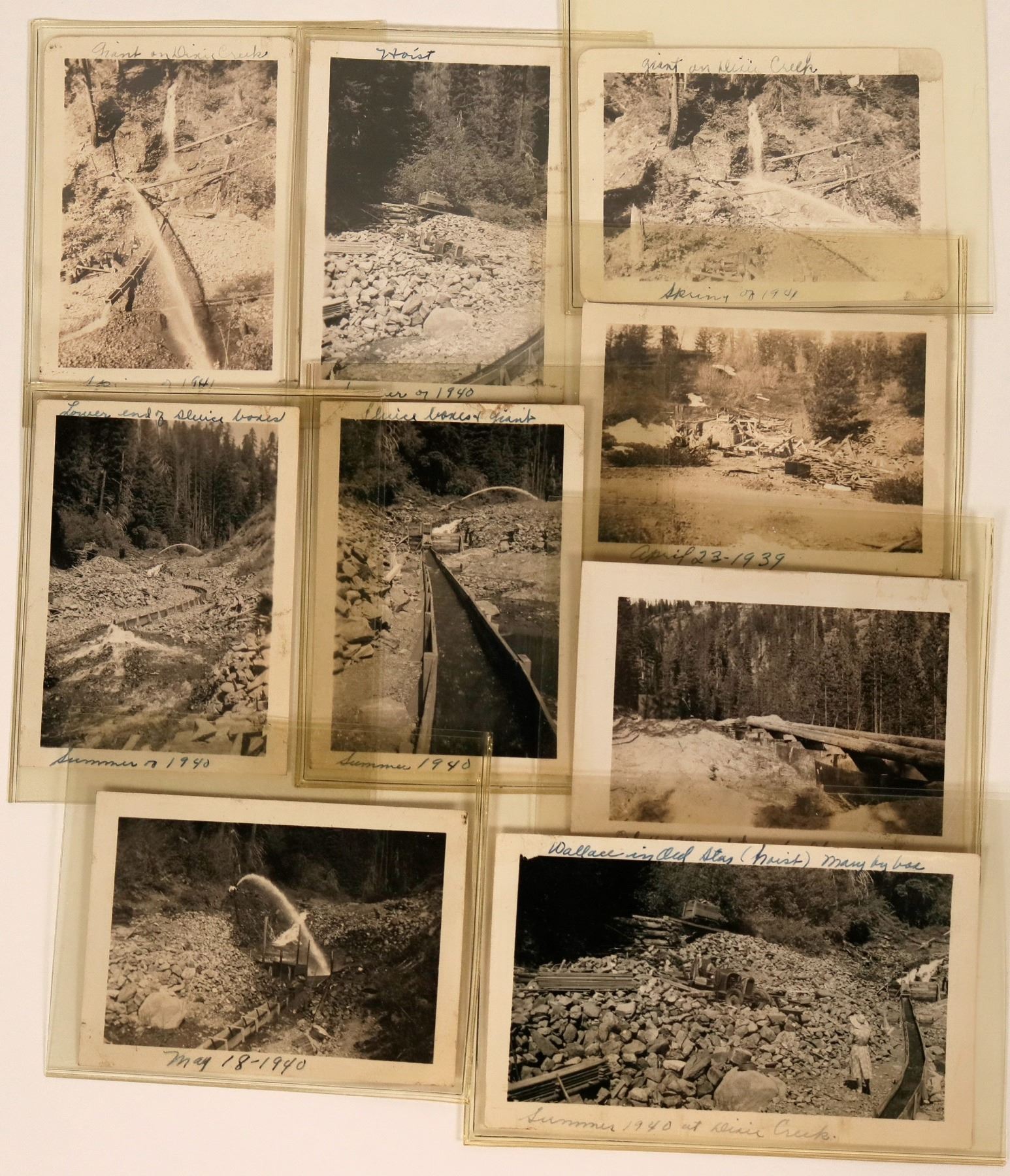 This is a collection of (9ct.) photos of mining operations on Dixie Creek in northeast Oregon. Please see photos for details. C. 1939-1941.