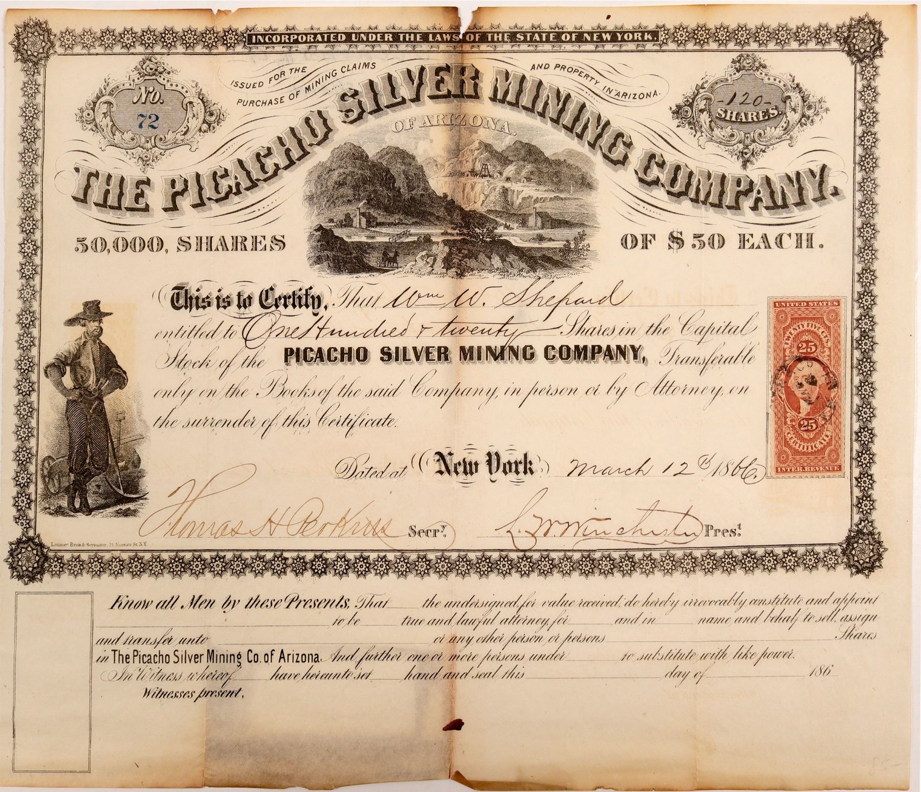 The Picacho Silver Mining Company of Arizona, Incorporated under the Laws of New York, cert No. 72. Issued to Wm W. Shepard for 120 shares. Dated (New York) March 12th, 1866. Signed by Thomas H. Perkins, Secry. and L. W. Winchester Prest. Lithograph by Latimore Bro's. & Seymour, 21 Naussau St., N.Y. This extremely rare, possibly unique certificate is important to not only early Arizona mining, but also for Civil War Historians, Overland Stage Collectors, and those interested in infamous Western Outlaws. The United States took possession of the area of Arizona north of the Gila River in 1848 after the Mexican American War, and secured the area south of the Gila River in 1854 under the terms of the Gadsen Purchase. The Mormon Battalion's march through southern Arizona in 1848 helped blaze the way for the Gadsden Purchase. They were the only religion-based battalion and constructed a wagon road through Picacho Pass, opening a southern wagon route to California, which was used by many forty-niners during the Gold Rush. The route was later traversed by the Butterfield Overland Stage to carry passengers.