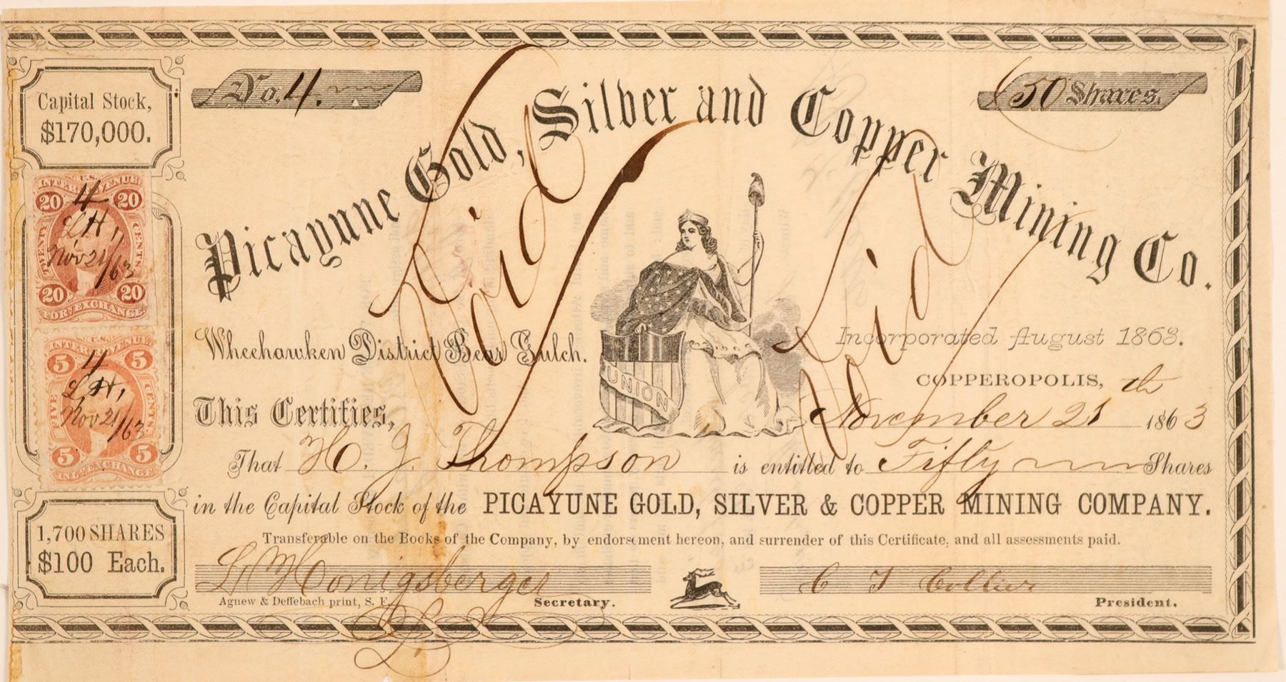 Wheehawken District, Bear Gulch (printed to the left of vignette). Dateline Copperopolis, November 25th, 1863. Inc. August 1863. Low stock number 4, issued for 50 shares to HJ Thompson. Signed by president CT Collier and secretary L. Hongsberger(?). Pen cancelled. Black border and print. Vignette of patriotic allegorical woman with flag and shield. Printed by Agnew & Deffebach, SF. One 20 cent and one 5 cent adhesive revenue stamp attached on the left, pen cancelled. Folds, bent corners. Left border trimmed tight. 4.75 x 9" The Weehawken (or Wheehawken) District was located 10 miles NW of Copperopolis, according to copper ore specimens from the Suffolk Mine listed in Journals of the Senate and Assembly California Legislature, 1864. Not listed in Filer or Holabird Indexes. No info. could be found on this company. Rare district! Ken Prag Collection