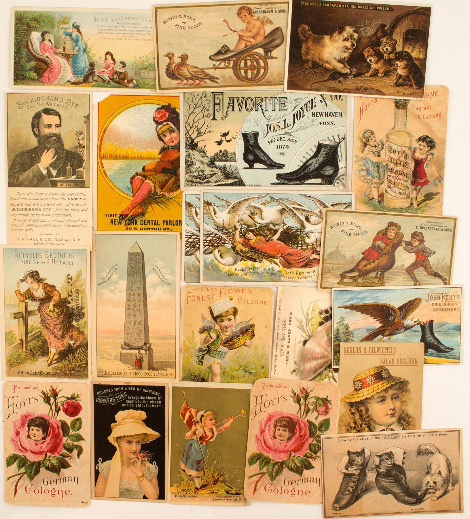 Lot of twenty-one. One fold out card - Buckingham's Dye. Others include Brown's shoes, Gordon & Dilworth Salad Dressing, John Kelly Shoes, Edwin Burt Shoes, Hood's Sarsaparilla, Ayer's Sarsaparilla, Hall's Hair Renewer, Hoyt's German Cologne, Austin's Forest Flower Cologne, Reynolds Brothers Shoes,Joyce shoes, Parkers Tonic, wtc. State: City: HWAC#: 49059 Date: