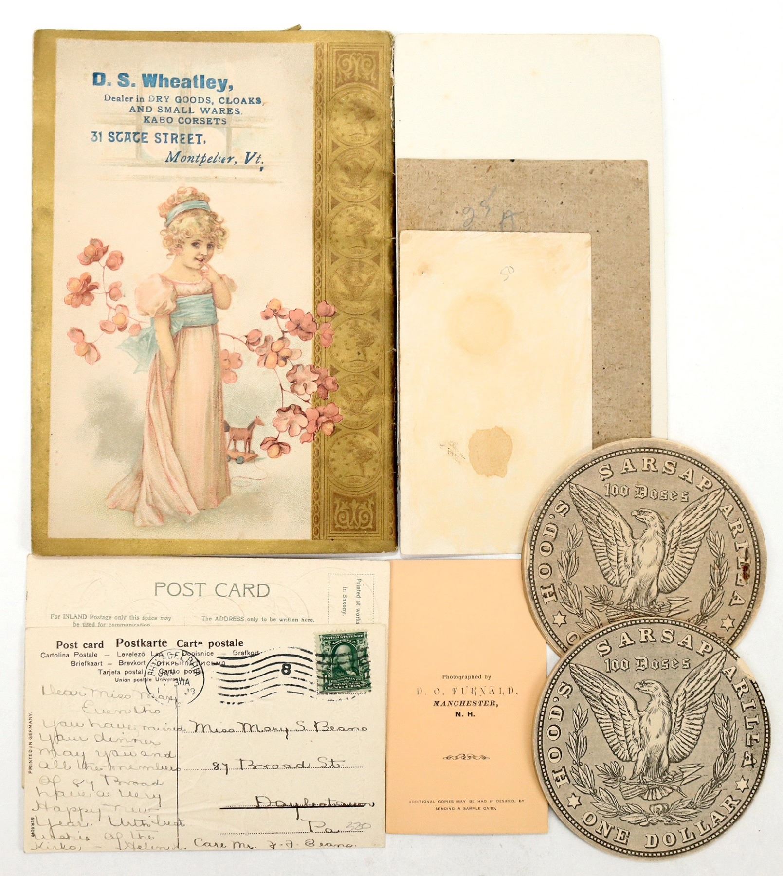 Nine pieces of numismatic ephemera: 1870s store card with a tray of Seated Liberty coinage, Manchester, New Hampshire; Capital Almanac with gold coin border; cabinet card from Cleveland Ohio with a racketeer nickel logo; two vintage post cards with coinage; two Morgan dollar advertising books for Hood's Sarsaparilla; store card from San Francisco; Take Care of the Cents and the Dollars will take care of themselves.