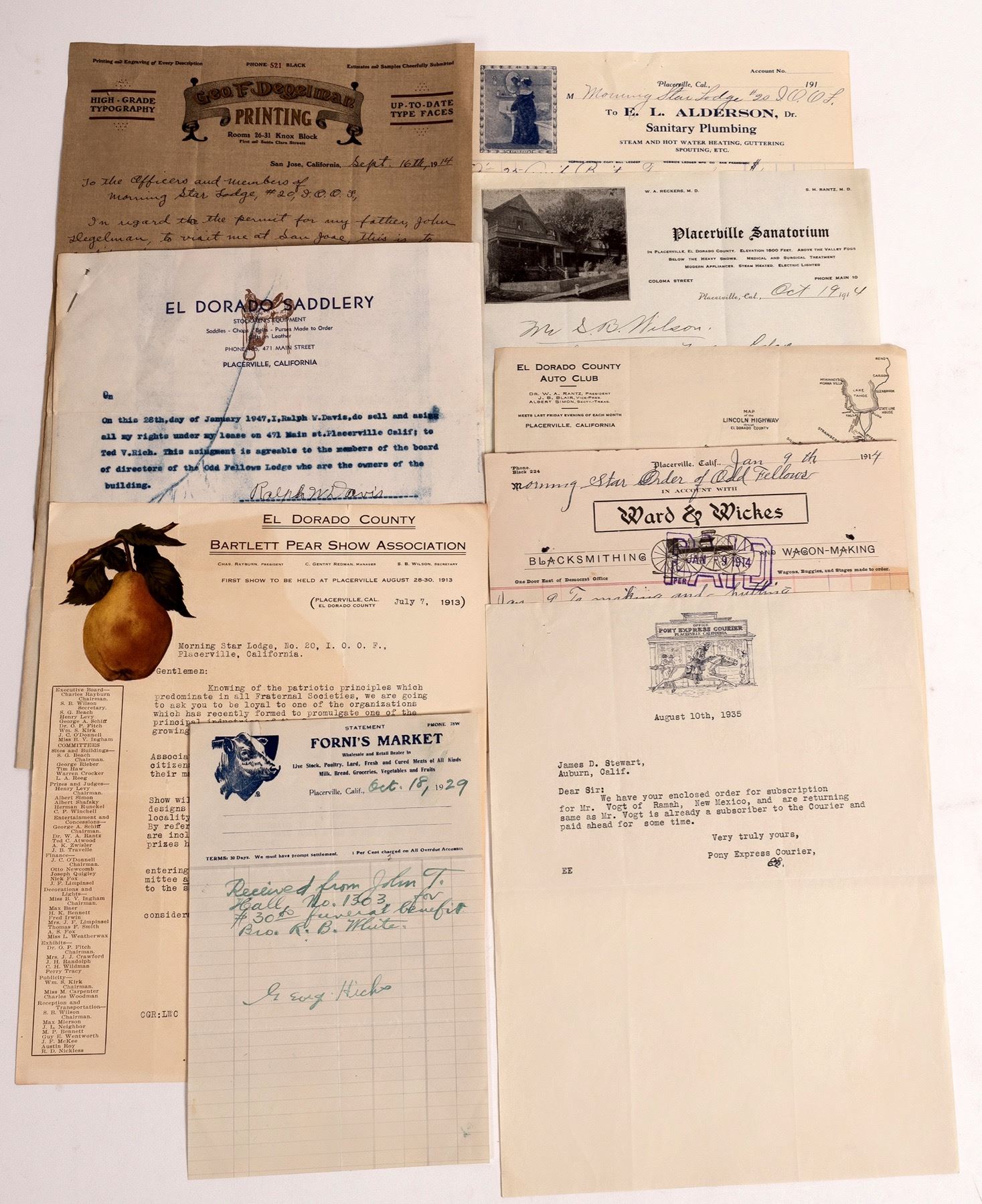 Lot of 10. Mostly 191-ës. Includes Degelman Printing, Alderson Plumbing, Placerville Sanatorium, El Dorado County Auto Club, El Dorado Saddlery, Bartlett Pear Show, Ward & Wicks blacksmithing, Fronius Market, Pony Express Courier. 1913-1935. State:California City:Placerville Date: Provenance: