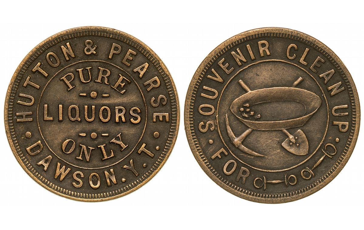 This is a souvenir token from Hutton & Pearce in Dawson. Pictorial of a shovel, pick, and gold mining pan. "Pure Liquors Onnly!"