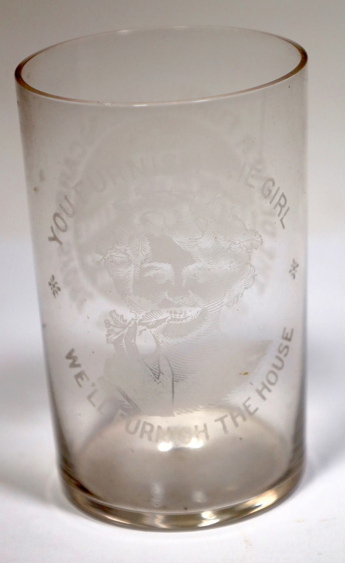 Nice pictorial etched beer glass. White lettering: The Denver Furniture and Carpet Store / The / Little-At-A-Time/ Store / Just Around the Corner / From the Post Office / Denver, Colorado // You Furnish the Girl / (lady pictorial) / We'll Furnish the House. 3.5"H x 2.25"W Two tiny chips on lip, some small scratches. Very nice!