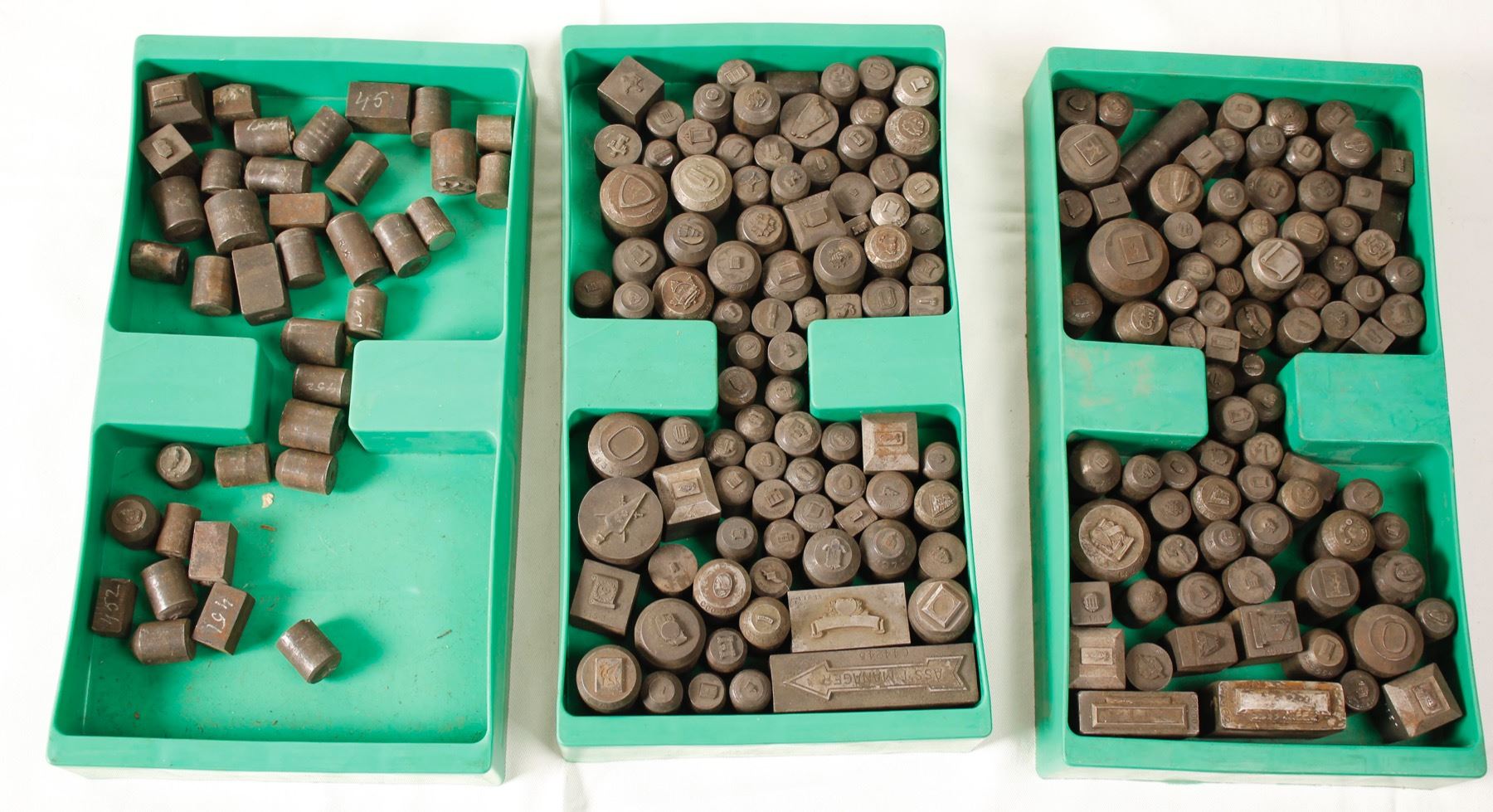 About 220 hubs from an unknown die sinker in Seattle, various sizes, many are of buildings. From the NWTM Historical Die Collection. Occupies three trays of the green US MInt boxes, about ten pounds. State: City: Date: HWAC# 84820