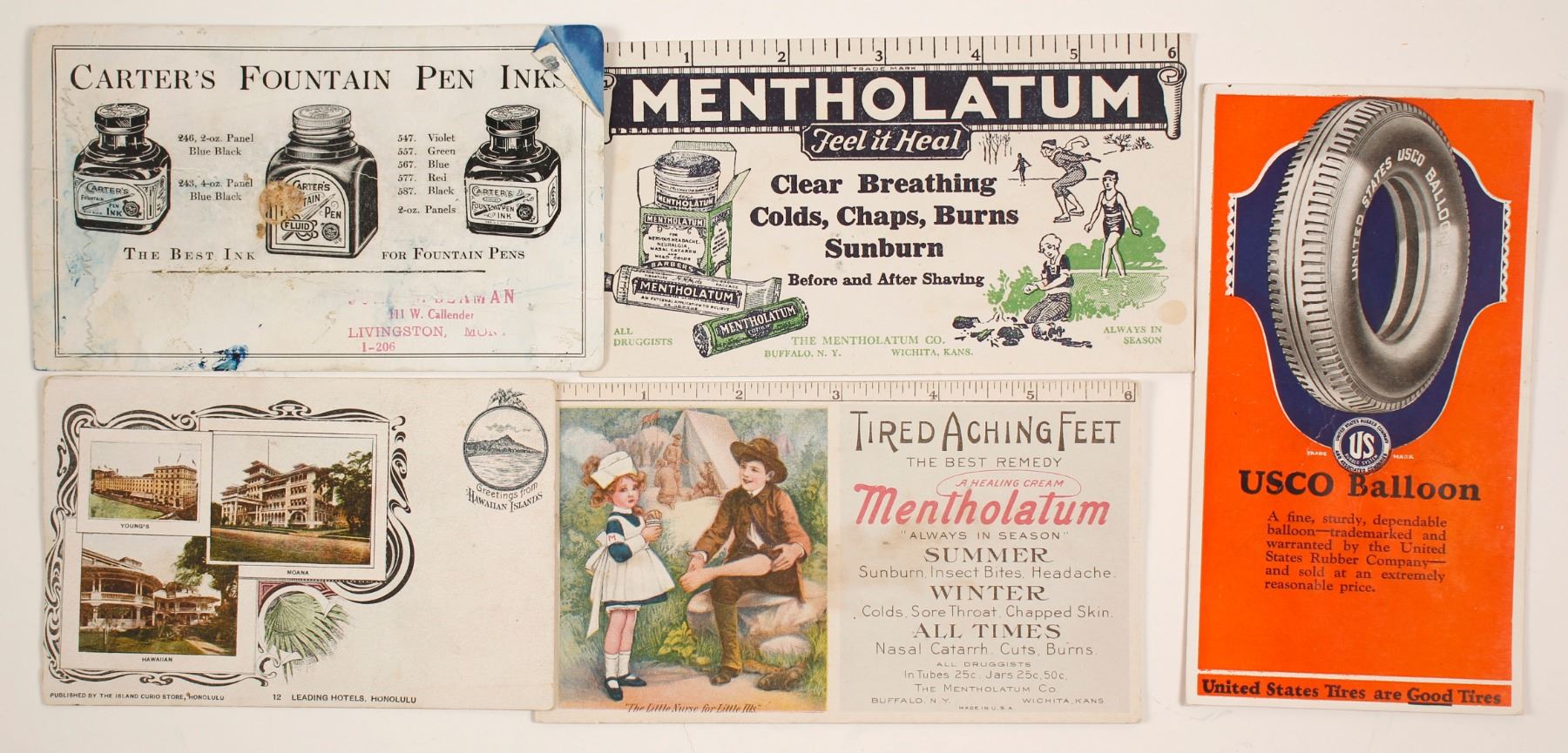 Honolulu Hotels postcard, 2 Mentholatum, USCO Ballroom, Carter's Fountain Pen Ink.